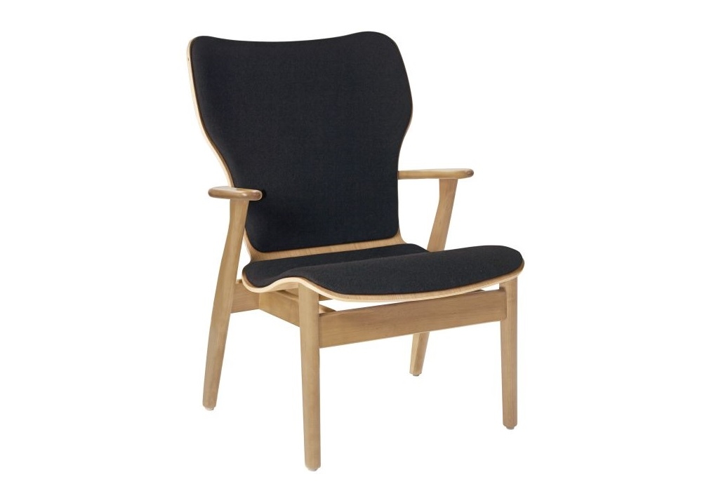 Domus designed by Ilmari Tapiovaara for Artek is a lounge chair made with structure in solid birch or oak and seat and back upholstery in fabric or leather. Available in different finishes.