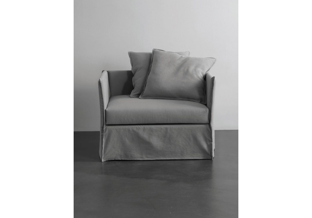Fox designed by Andrea Parisio for Meridiani is an upholstered armchair-bed with bearing base with metal frame and wooden slats, padded wooden panels in polyurethane. Upholstery available in fabric only. Seat & mattress in polyurethane and anallergic polyester fibre with removable cover. Fold metal mechanism with electric welded base, including a mattress made of polyurethane and anallergic fibre.