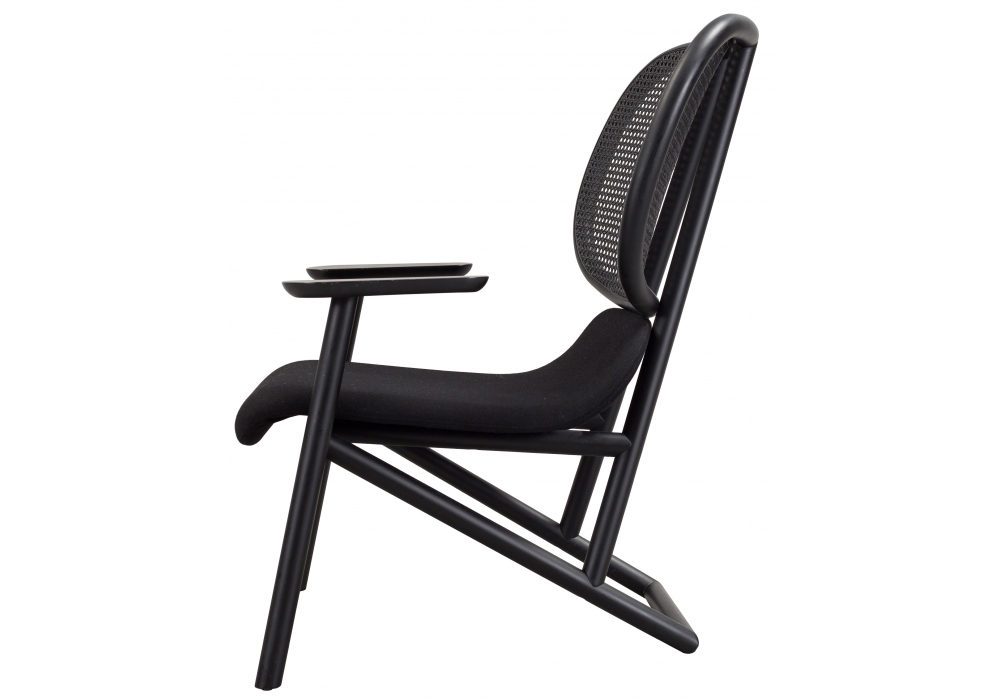 Klara designed by Patricia Urquiola for Moroso is an armchair with structure in matt black painted beech and back in natural Vienna straw. The seat is upholstered in fabric or leather.