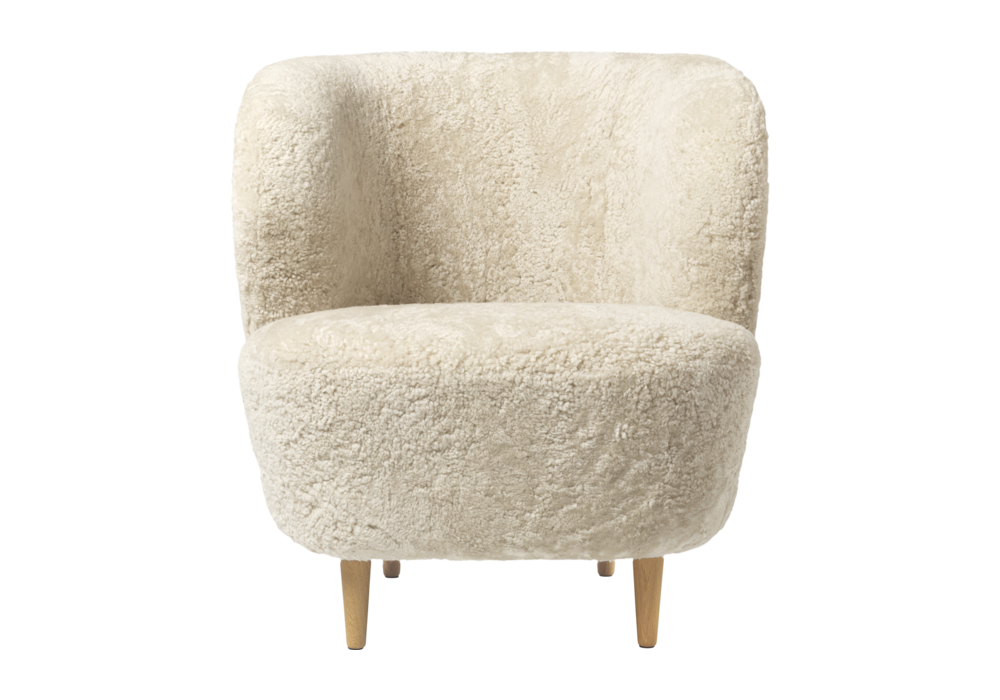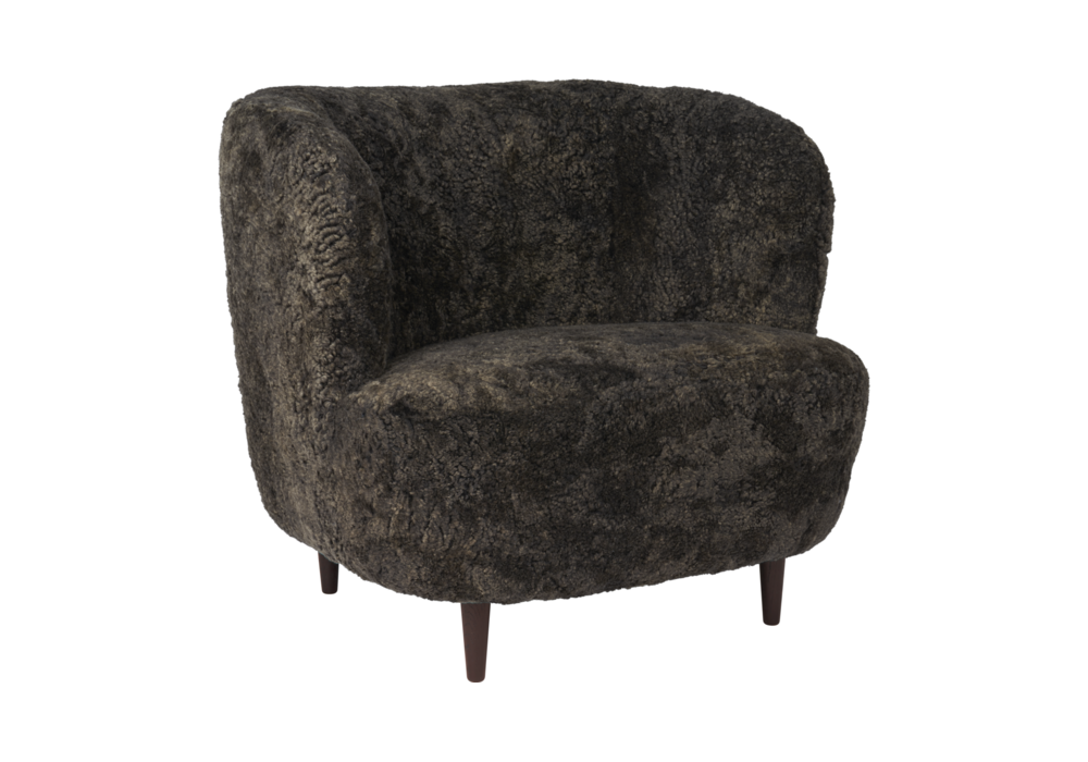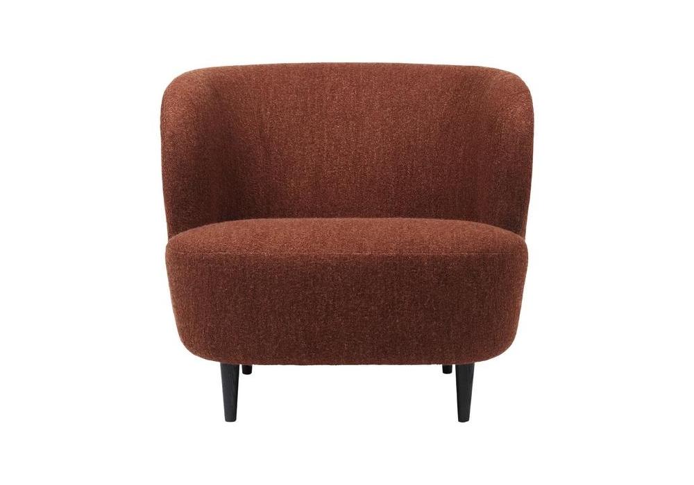 Stay designed by Space Copenhagen for Gubi is a lounge chair with wooden legs and fabric or leather upholstery.