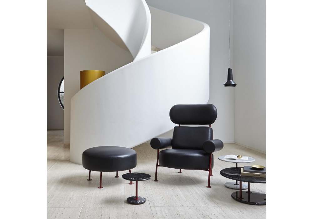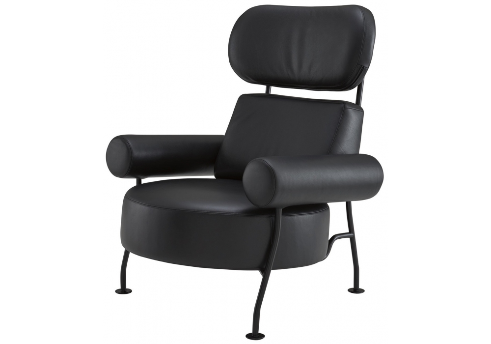 Astair designed by Pierre Charpin for Ligne Roset is an armchair with base in bordeaux or black-lacquered tubular steel. Seat cushion with pocket-sprung suspension, high resilience polyurethane Bultex foam. Back cushion and headrest made from high resilience polyurethane Bultex foam. Upholstery available in fabric or leather.
