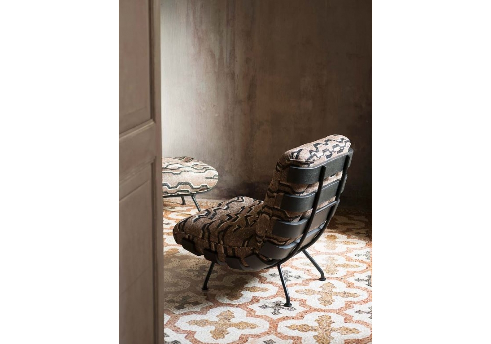 Costela designed by Martin Eisler for Tacchini is an armchair with structure made with slats in open pore stained ash in various colors. Base in painted metal. Non-removable cover, available in fabric or leather in different colors.
