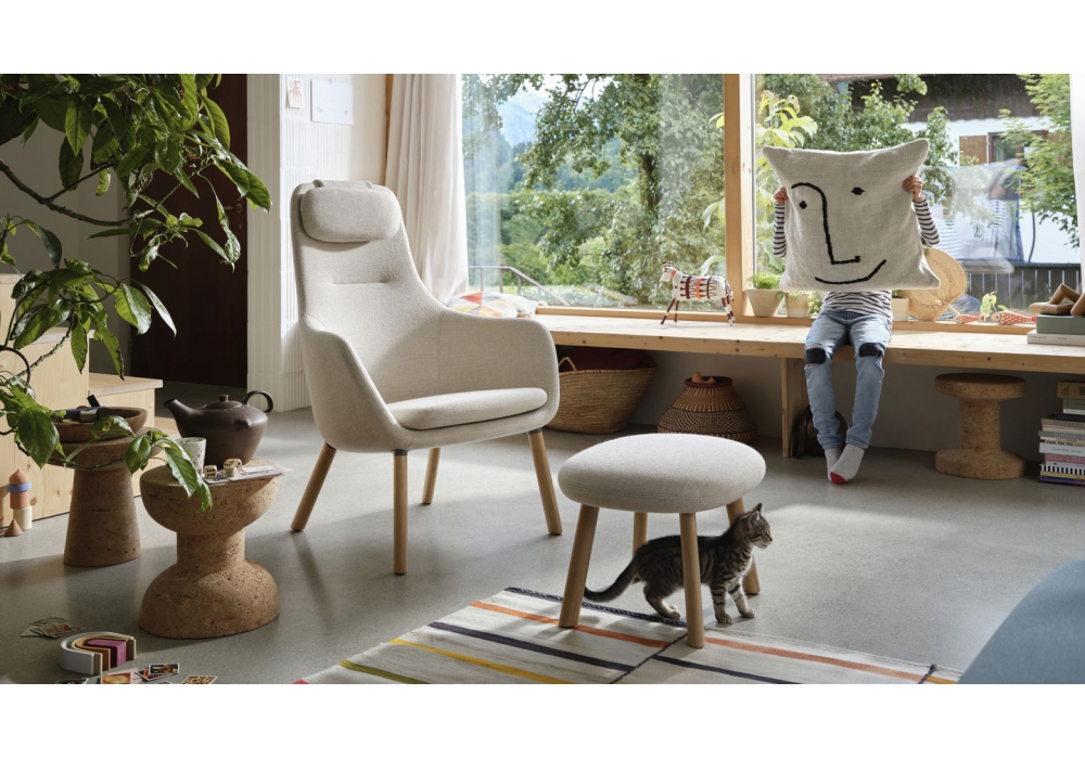HAL designed by Jasper Morrison for Vitra is an armchair with footrest made with removable upholstery in fabric or leather and base in oak wood. The seat cushion can be integrated or loose. Available in different finishes.