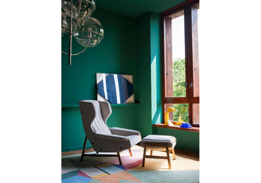 Giulia designed by Gianfranco Frattini for Tacchini is an armchair with internal structure in fir plywood, padding in multi-density polyurethane foam. The base is in open pore dyed solid ash, in different finishes. The upholstery is available in fabric or leather, in many colors.