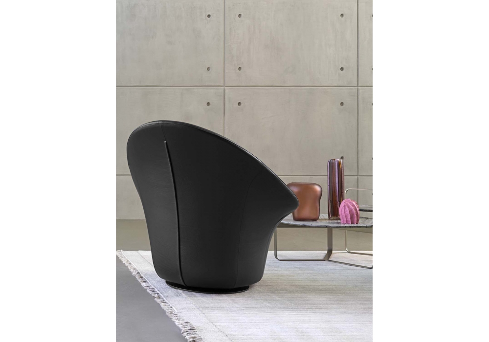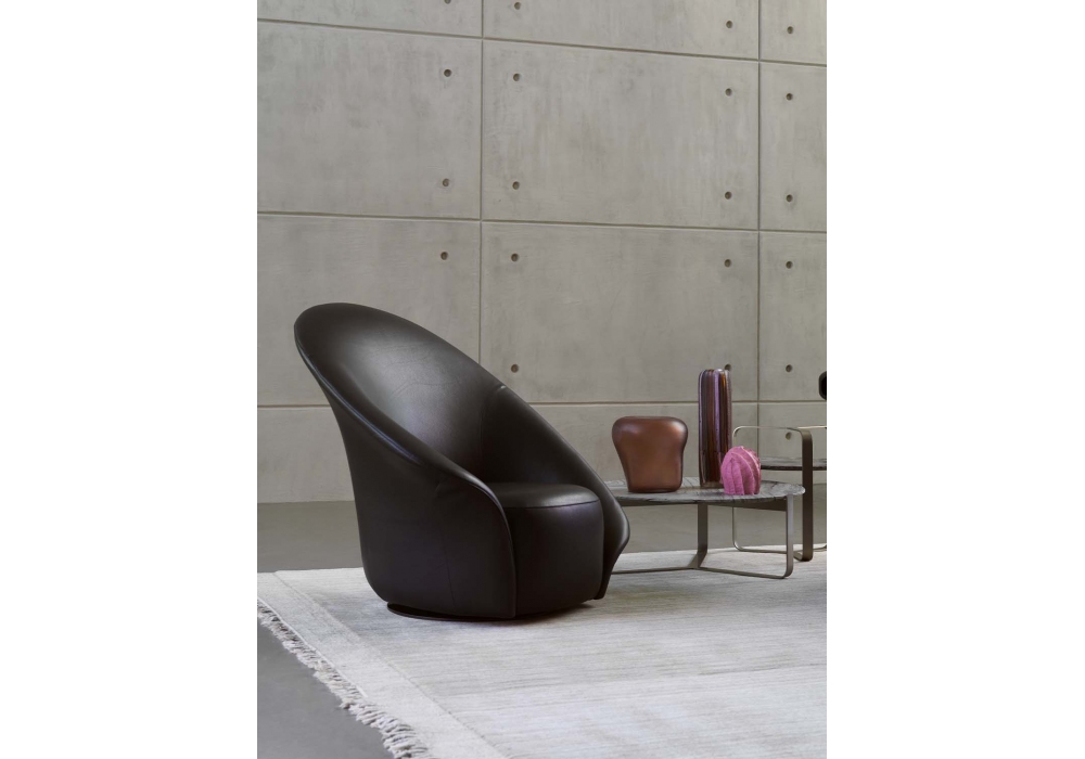 Lilia designed by Steve Leung for Flou is a swivel upholstered armchair with completely removable fabric or leather covering. Metal base.