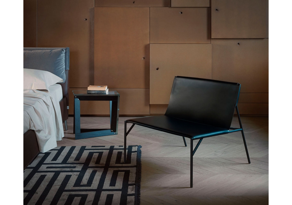Tout le Jour Lounge designed by Marc Thorpe for Casamania & Horm is an armchair made with a supporting structure in black painted metal tubing. Belted seat for optimal comfort and leather upholstery.