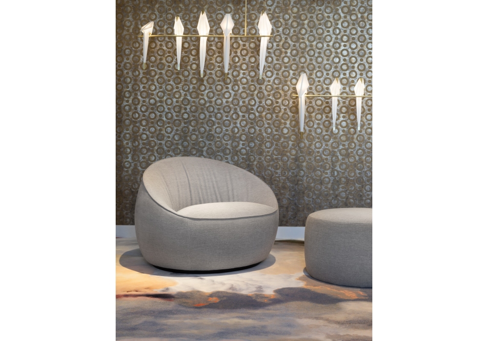 Hana designed by Simone Bonanni for Moooi is a circular upholstered armchair metal frame, available in fixed or swivel version. Covering in fabric or leather.