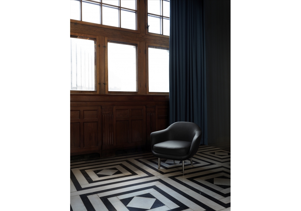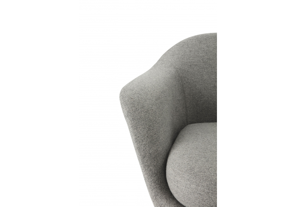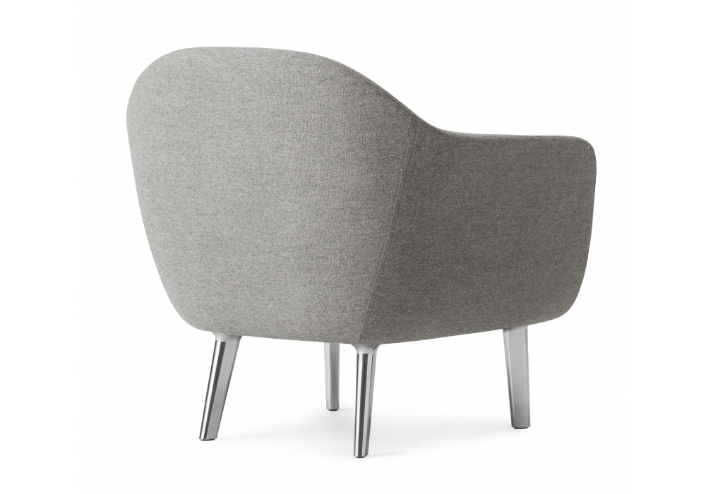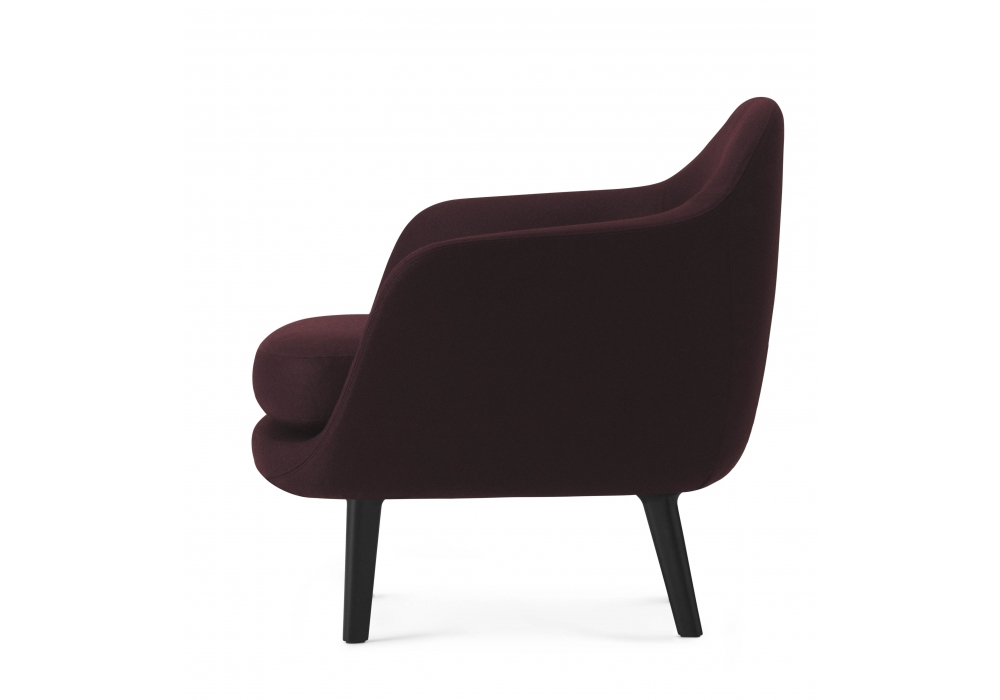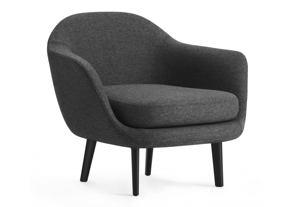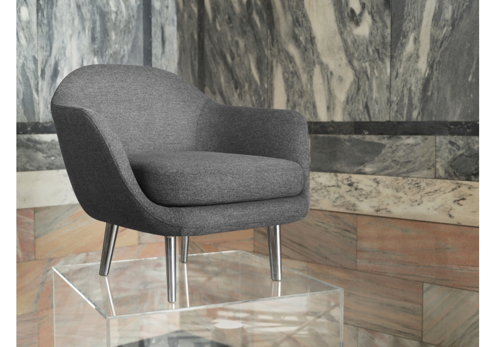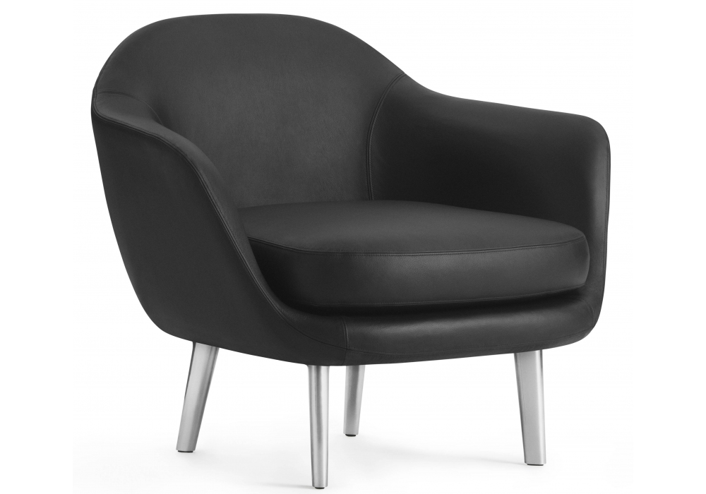 Sum, designed by Simon Legald for Normann Copenhagen is an armchair, with backrest and seat modeled in a single body, structured between the combination of wood and steel. Fully lined in fabric or leather available in different finishes. The legs are conical in black aluminum or bare silver aluminum.