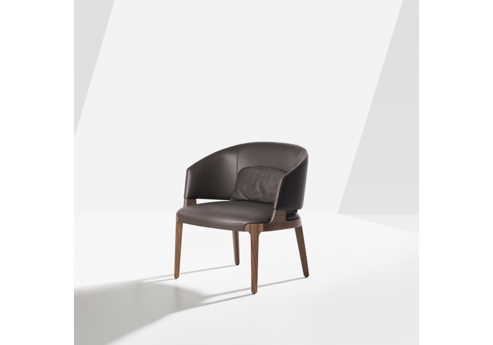 Velis designed by Mario Ferrarini for Potocco is a lounge armchair with structure in ash or American walnut wood in different finishes. Seat and backrest are padded with fireproof polyurethane foam and covered in various types of fabric, leather or eco-leather.