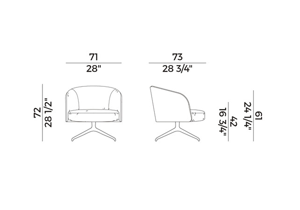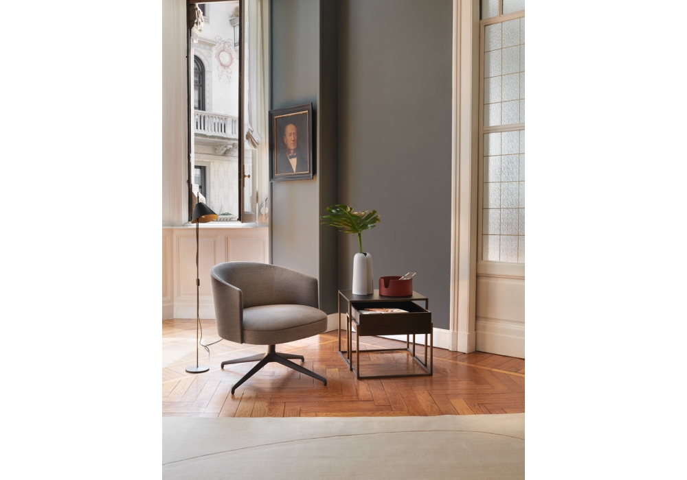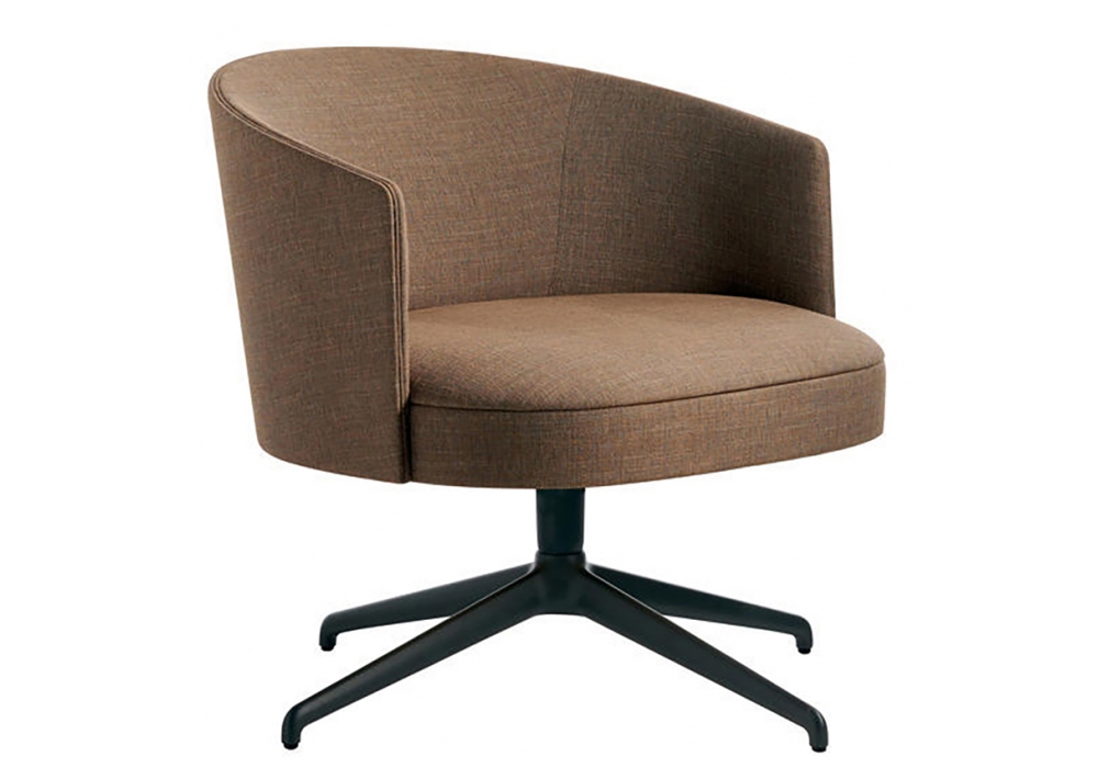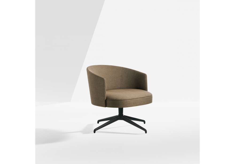 Léna designed by Gabriele and Oscar Buratti for Potocco is an armchair with four-star swivel base in embossed black painted aluminum or embossed anthracite. Seat and back are padded with fire-retardant polyurethane foam and covered in various types of fabric, leather or eco-leather.