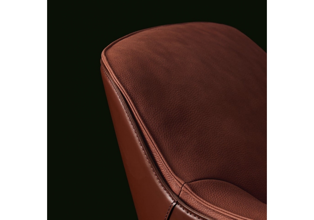 Kaori designed by Jean-Marie Massaud for Poliform is an armchair with outer shell and base covered in hide, inner shell and seat available with upholstery in fabric or leather. Feet in aluminium and steel structure painted mat champagne or brown nickel, mat and glossy.