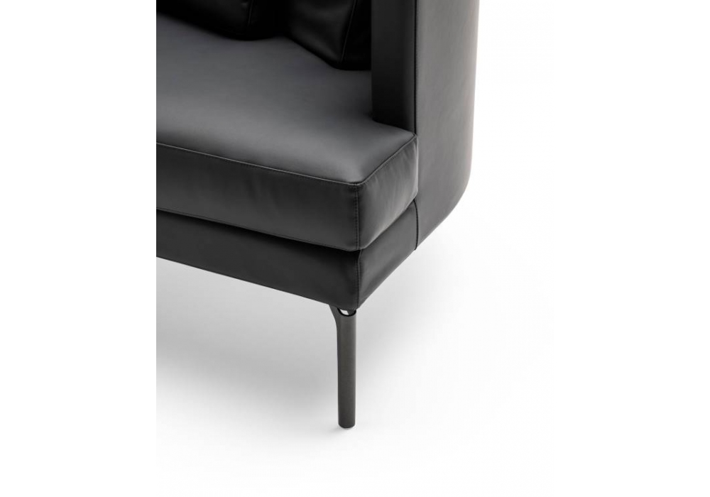 Clan with Curved Backrest designed by Piero Lissoni for Living Divani is an armchair with supporting structure in wood and preformed curved plywood with padding in differentiated density polyurethane foam; seat suspension with woven elastic straps in coated rubber. Padding in differentiated density polyurethane foam. 42x42cm decorative cushions in goose down. Fully removable leather or fabric upholstery. Feet made of sheet steel, painted with epoxy powders in gunmetal gray or burnished color. Glides in thermoplastic material.