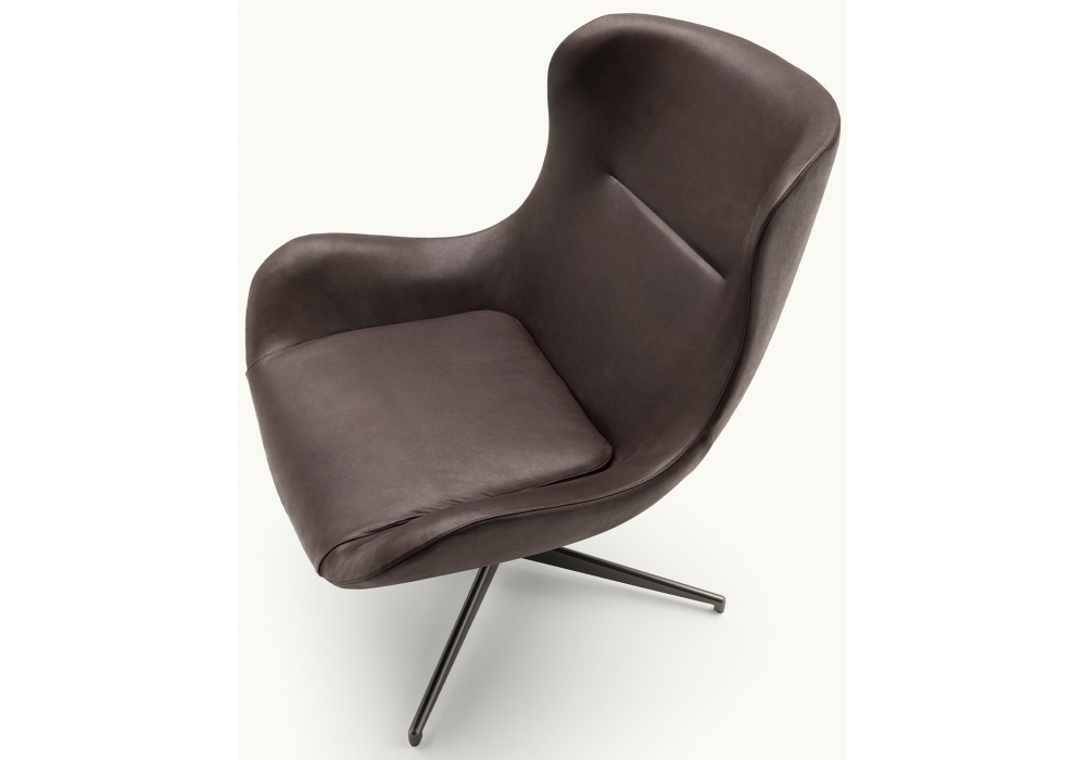 Oolong designed by Piero Lissoni for Living Divani is a swivel armchair with a steel structure drowned in cold-foamed polyurethane with polyurethane foam insert a differentiated densities. Swivel base with return mechanism in sheet steel, painted with epoxy powders in burnished or gunmetal gray. Interchangeable PVC glides (in black PVC or felt) according to the floor. Upholstery in fabric or leather, fully removable.