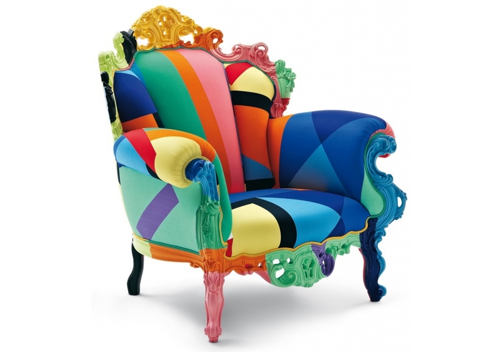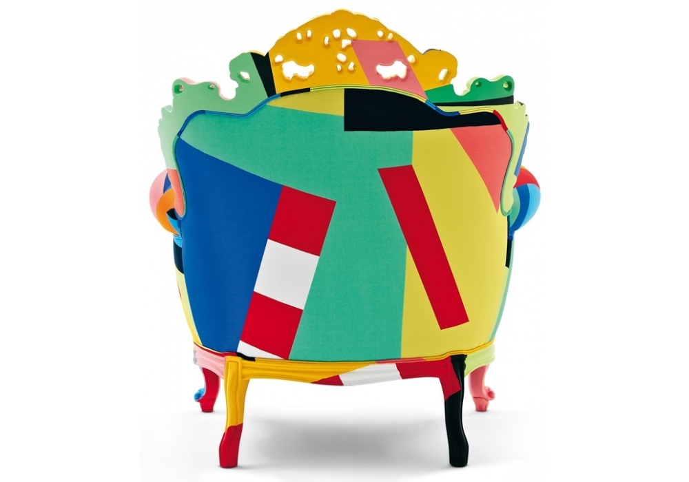 Proust Geometrica designed by Alessandro Mendini for Cappellini is an armchair with wooden structure and multicolor cotton upholstery.