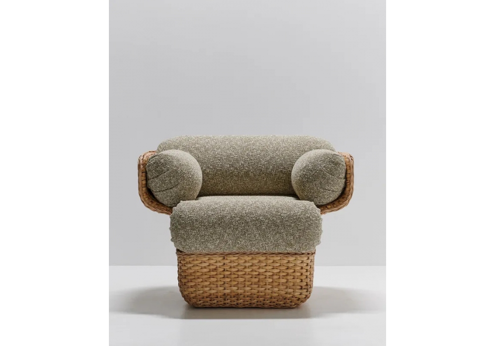 Basket designed by Joe Colombo for Gubi is an armchair with rattan base and fabric upholstery.