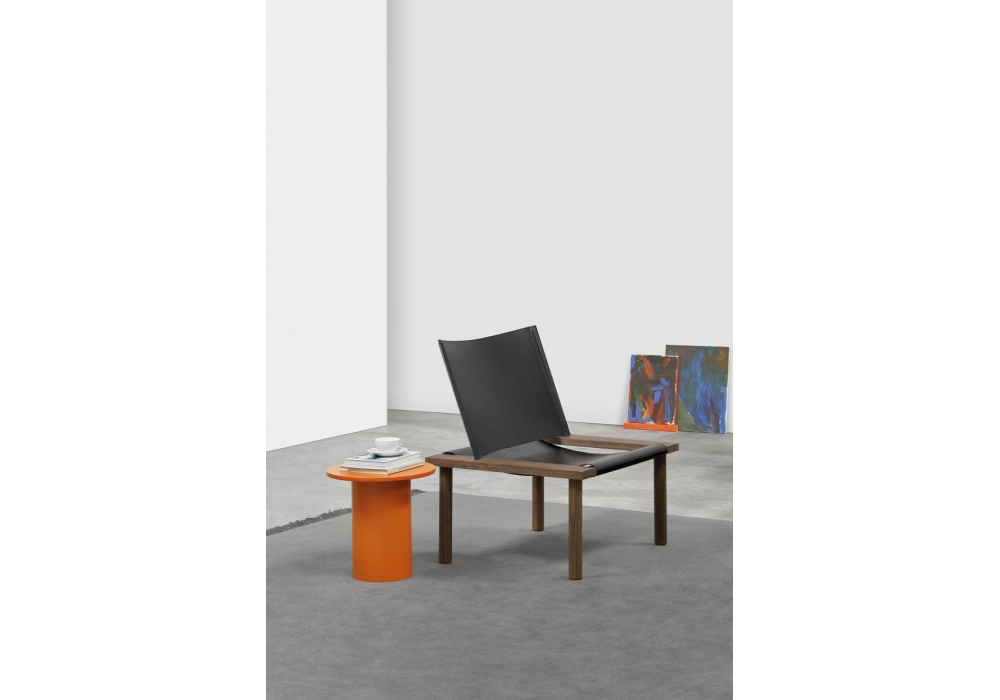 Ilma designed by Jonas Lutz for E15 is a lounge chair with wooden structure, is made of European oak or walnut and is coupled with a soft and sturdy harness with natural, brandy or black leather.