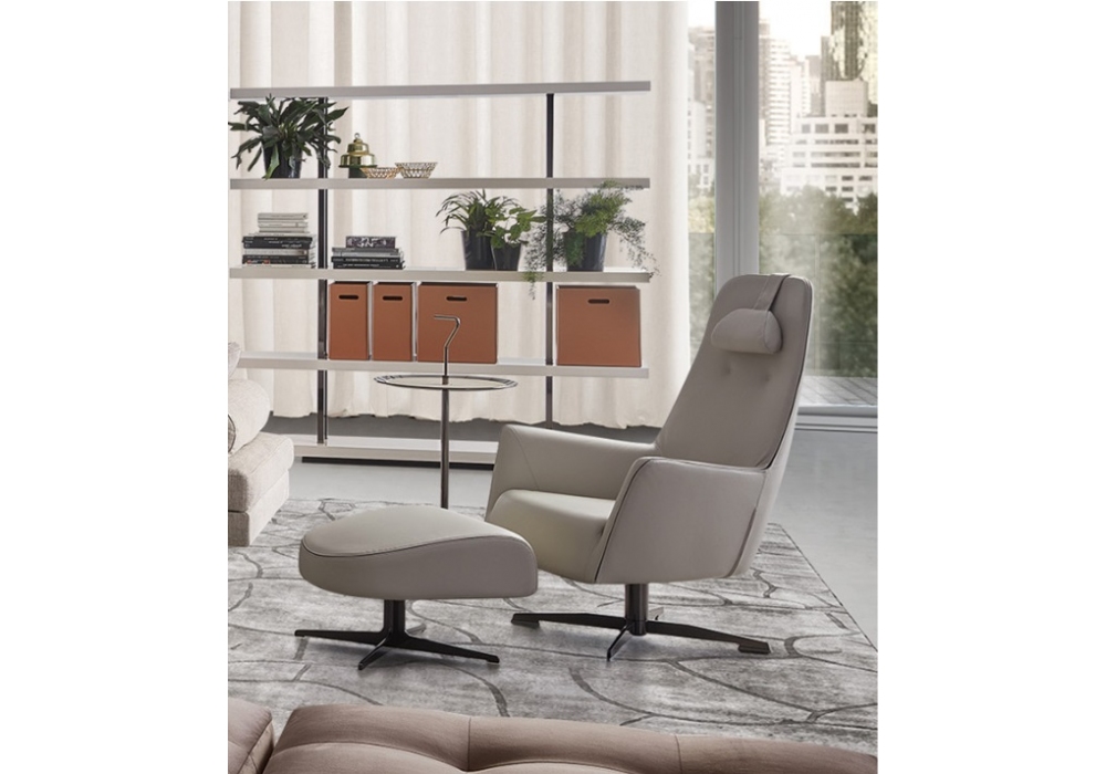 Valentina designed by Carlo Bimbi for Dema is a swivel armchair with steel structure padded with molded polyurethane foam and covered with a protective fabric lining, springing with elastic belts, fixed base in laser-cut metal complete with anti-slip in molded thermoplastic material. Upholstery in fabric or leather with contrasting tape.