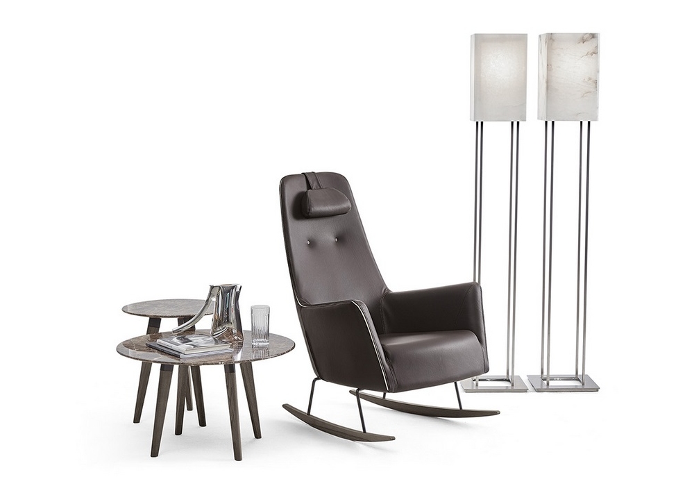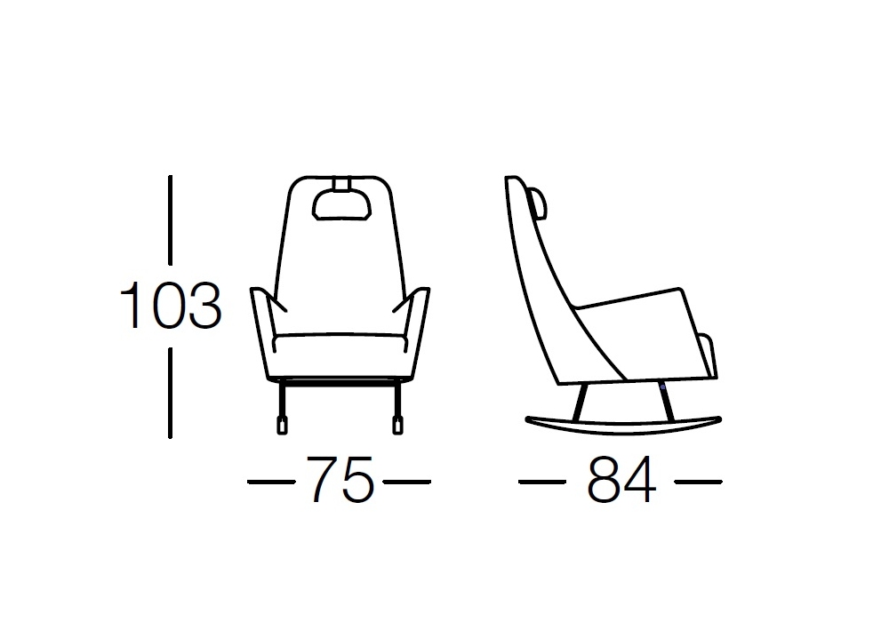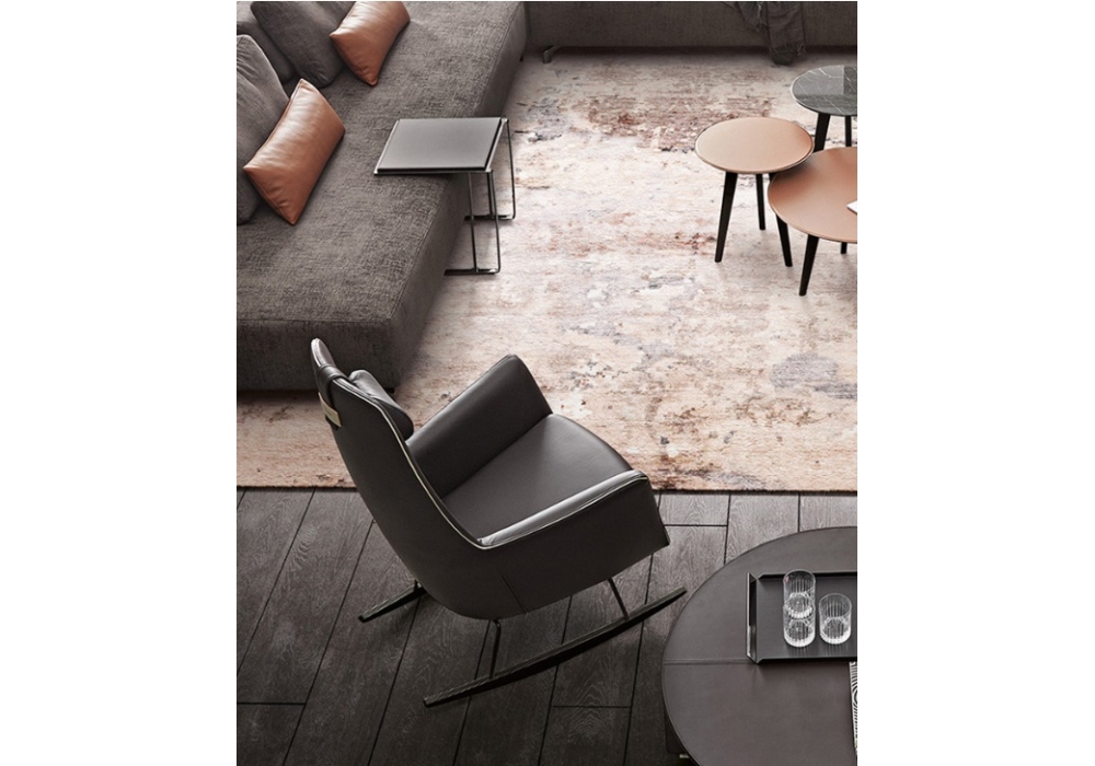 Valentina designed by Carlo Bimbi for Dema is a rocking armchair with steel structure padded with molded polyurethane foam and covered with a protective fabric lining, springing with elastic straps, rocking base structure in RAL 8022 metal with ash slides. Upholstery in fabric or leather with contrasting tape.