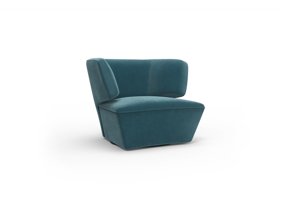 Diana designed by Momenti Lab for Momenti is an armchair with structure in solid fir, wood fiber, polyurethane covering. Swivel base with polished chrome finish and return to position system. Upholstery in different finishes, non-removable fabric or leather.