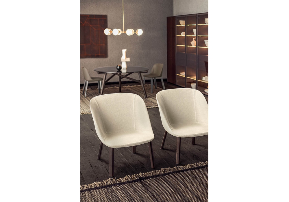 Esse Lounge designed by Philippe Tabet for Pianca is an armchair with wooden legs made of solid ash wood. Padded seat molded in polyurethane foam and upholstered in fabric or leather. The version with removable cover cannot be made in leather. Upon request, the legs can be covered exclusively with the same fabric, leather or synthetic leather as the seat.