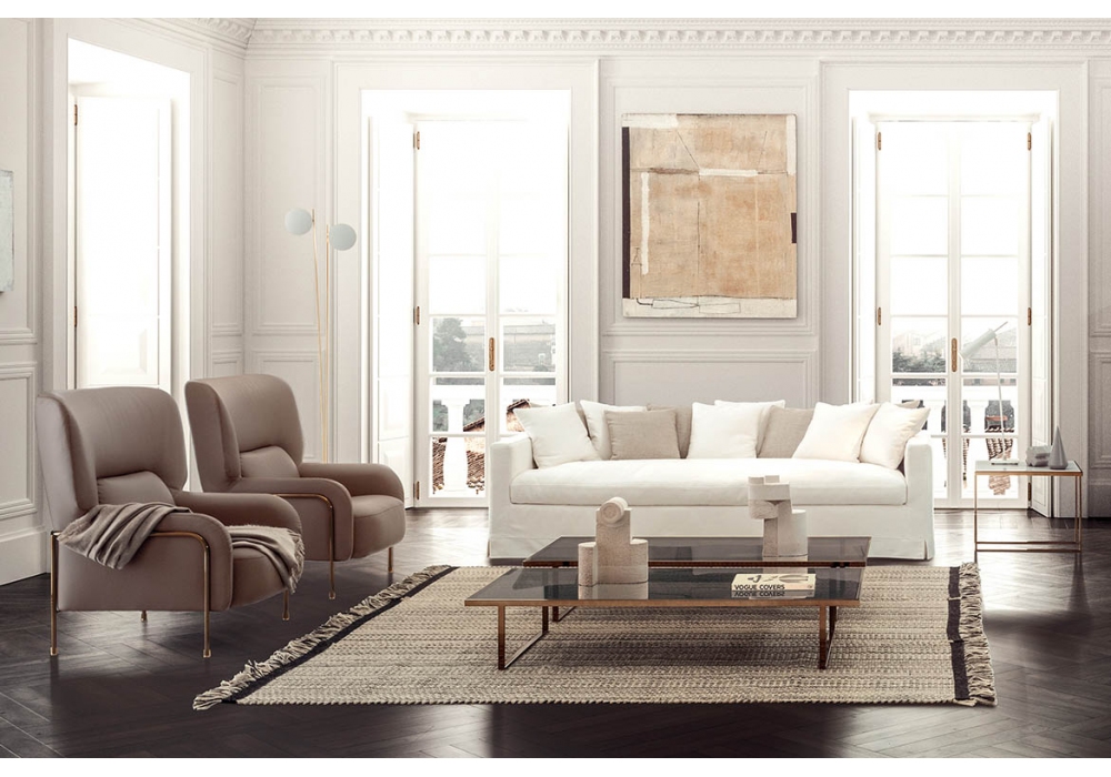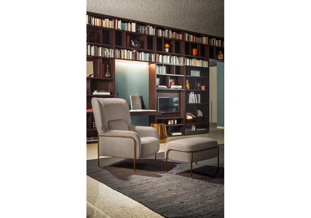 Platea designed by Emilio Nanni for Pianca is an armchair made with internal structure with an internal wooden frame, padding in differentiated density polyurethane foam, heat-bound wadding and velveteen covering. Base made of folded and welded matt lacquered steel or metal, decorated with a shiny brass metal ferrule. Non-removable fabric and leather upholstery. Available with or without pouf.