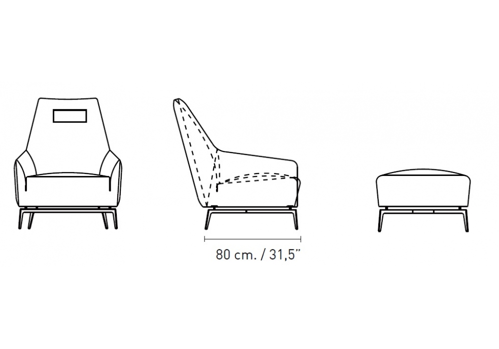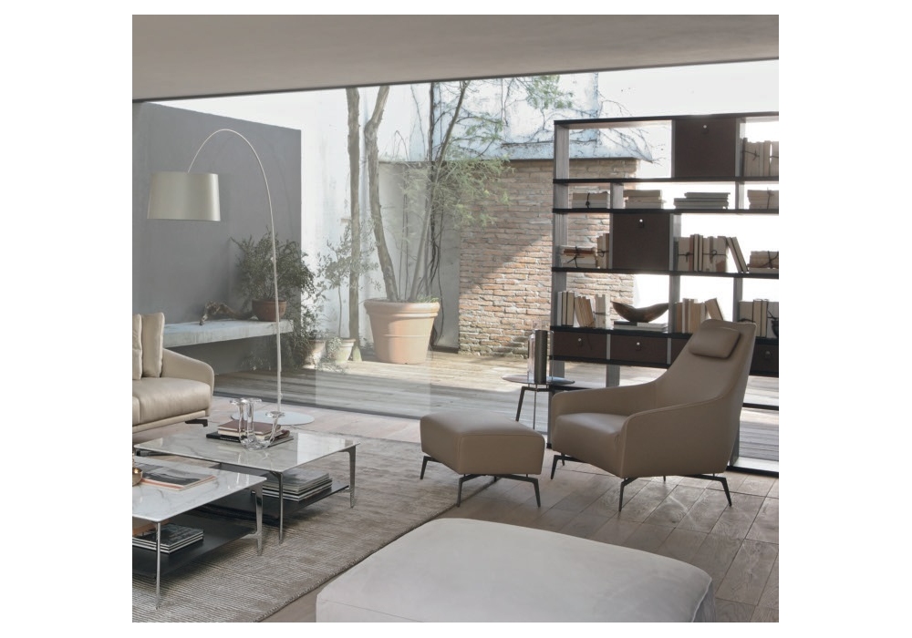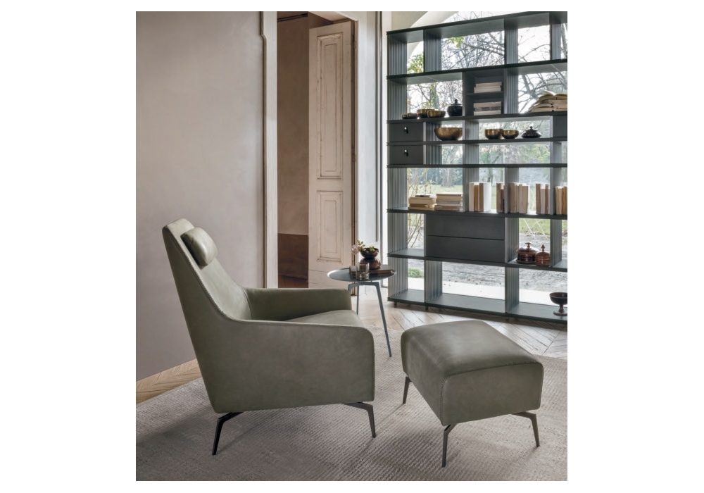 Carol designed by Giuseppe Bavuso for Alivar is an armchair made with Polymex structure covered in polyurethane rubber and polyester fiber lining. Magnetic and adjustable headrest. Base in chromed, painted, stainless steel with Peltrox or black nickel finish. Upholstery in leather or fabric. Tone-on-tone crotch stitching; contrast stitching on request. Available with pouf in the same finish.