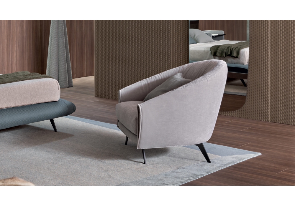 Saddle designed by Giuseppe ViganĂ² for Bonaldo is an armchair with removable fabric cover, in different finishes. The insert of the central armrest is in Ponza leather while that of the perimeter armrest is in the same finish as the upholstery. The feet are in matt painted metal, in various colors.