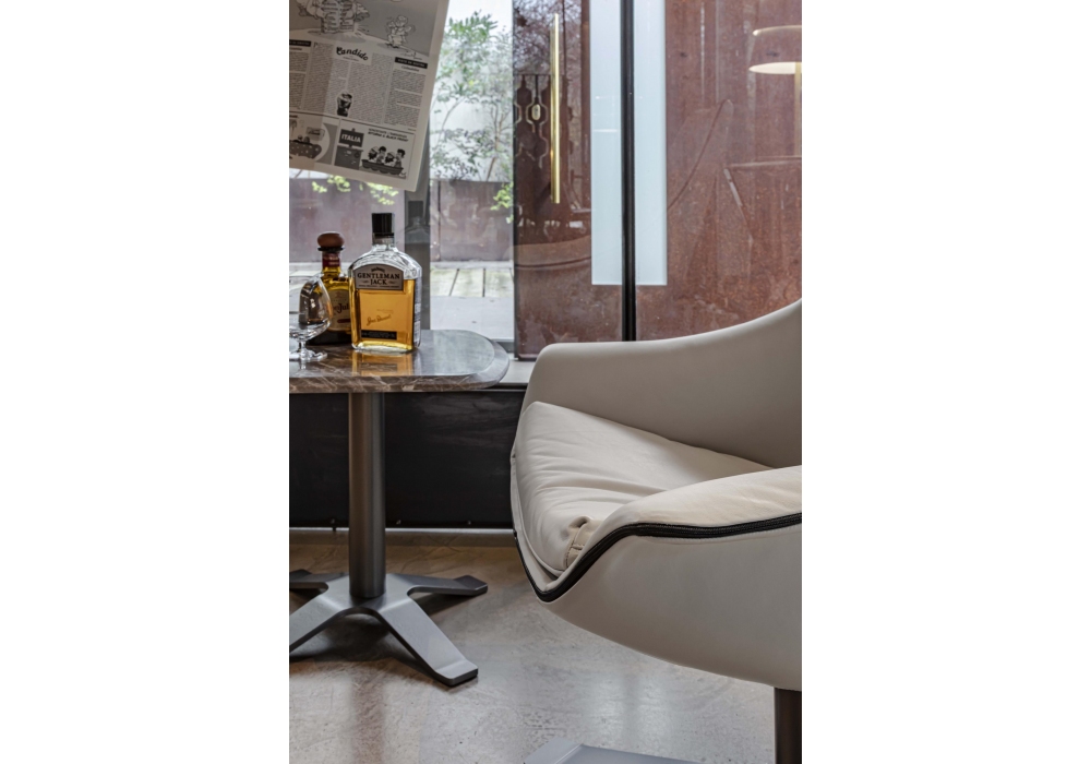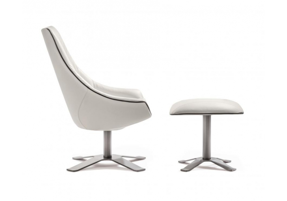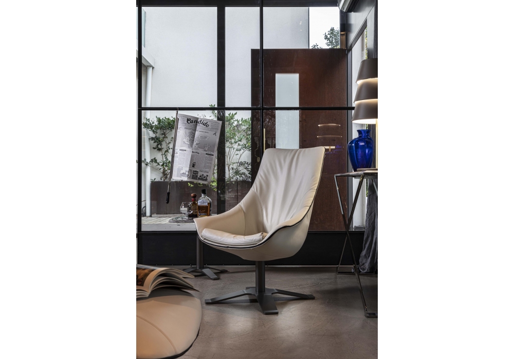 Lullaby designed by RedCreative for Enrico Pellizzoni is an armchair with rigid polyurethane shell, padded and upholstered in different materials and colours. Fixed lacquered base. Available in different finishes and in the version with high or low backrest. Integrated seat cushion.
