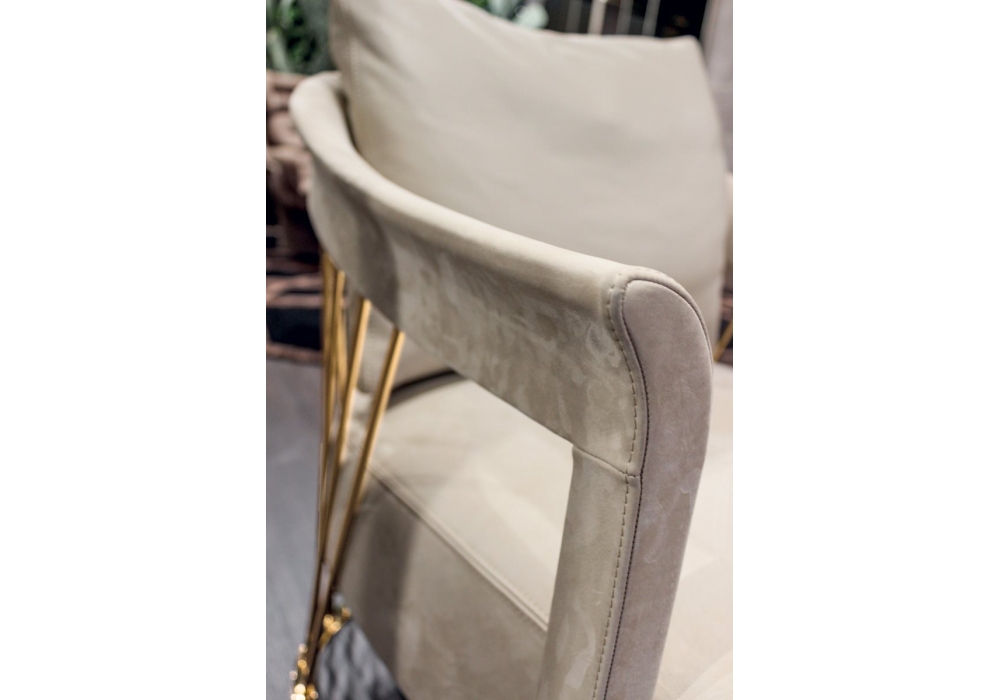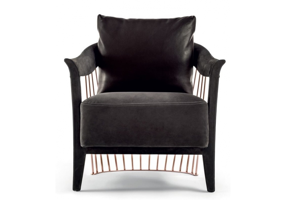 Dorothy designed by Giuseppe Iasparra for Longhi is an armchair with rigid cold-foam supporting structure with iron insert using a special mold. The upholstery of the structure is available exclusively in handcrafted hot-glued leather. Seat and back cushion upholstered in non-removable fabric or leather. Metal parts made with laser cut frame and individually assembled and chromed metal tubes. Available in different finishes.