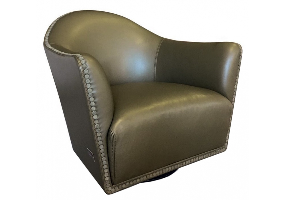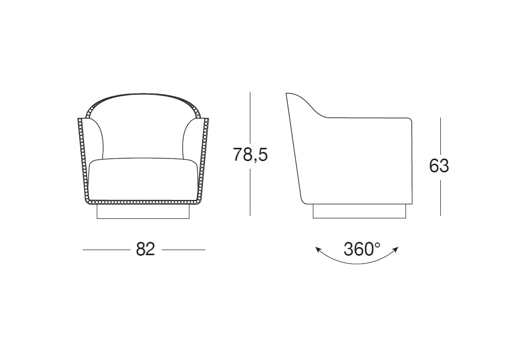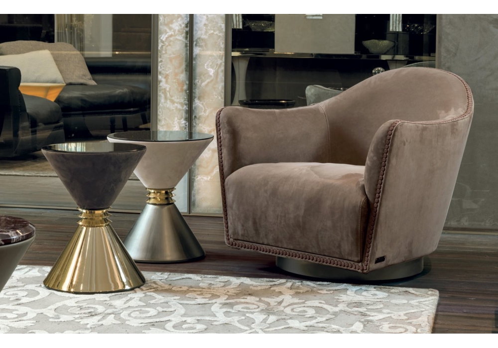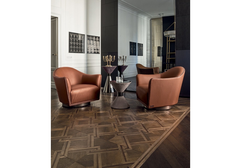 Vivienne designed by Giuseppe Viganò for Longhi is an armchair with 360° swivel base with ring in bronze painted metal. Seat structure in beech and fir plywood with high resistance elastic straps and covered in high density polyurethane foam. Upholstery in leather or non-removable fabric finished with visible buttons positioned manually and individually in different finishes.