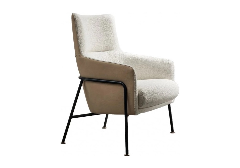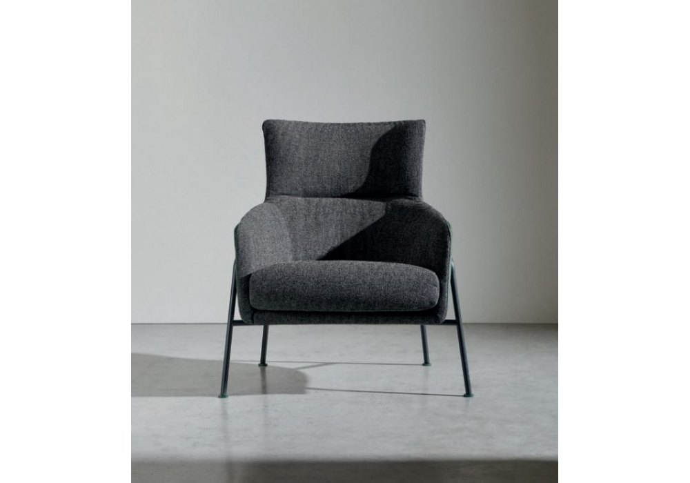 Adele designed by Antonio De Marco for Twils is an armchair with polyurethane foam padding, with internal structure in MDF and wood fiber and base in solid poplar and fir plywood. The external and internal coverings are available in different fabrics and colours. The feet are in Dark Gray painted metal and tips in 5 finishes.