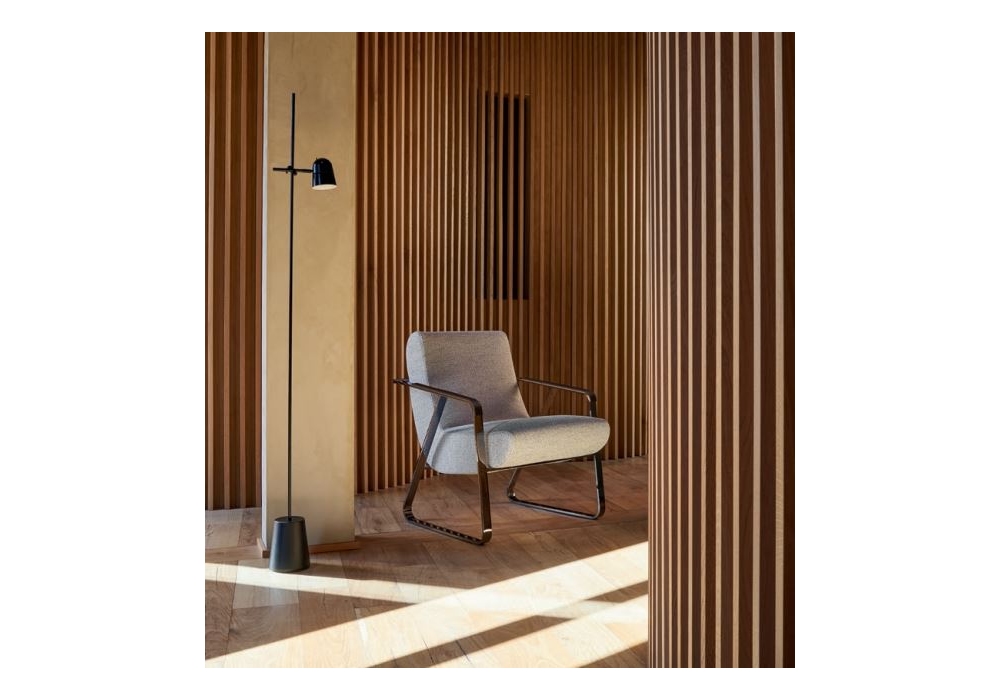 Moon designed by Matteo Ragni for Twils is an armchair with polyurethane foam padding, with internal structure in solid poplar and fir plywood. The completely removable cover is available in various fabrics and colours. Metal structure in black nickel with insert on the armrests in beige leather or Testa di Moro.
