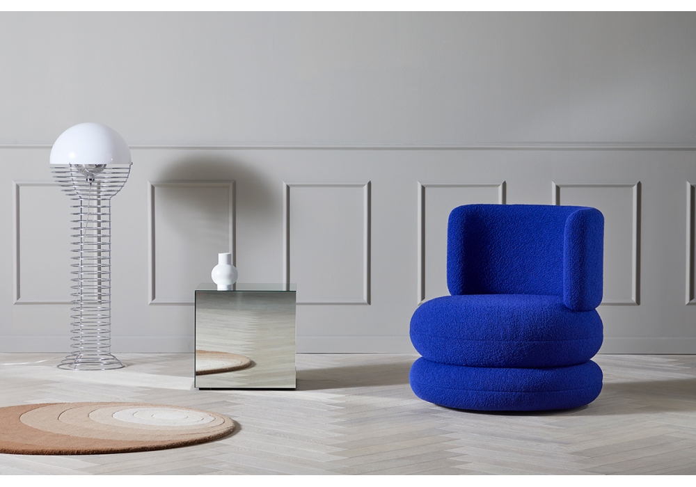 Easy Chair designed by Verner Panton for Verpan is a fully upholstered armchair with base in black MDF with felt pads. Structure in FSC & TSCA certified CMHR foam plywood with upholstery in different fabrics.