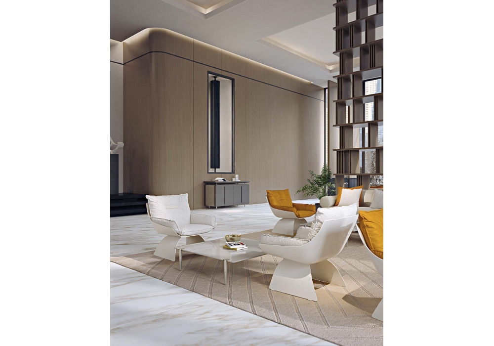 Silhouette designed by Gensler for Turri is an armchair with structure in matt white lacquered compact polyurethane. Padding in multi-density polyurethane foam with covering in different fabrics or leathers. Base in matt white lacquered metal.