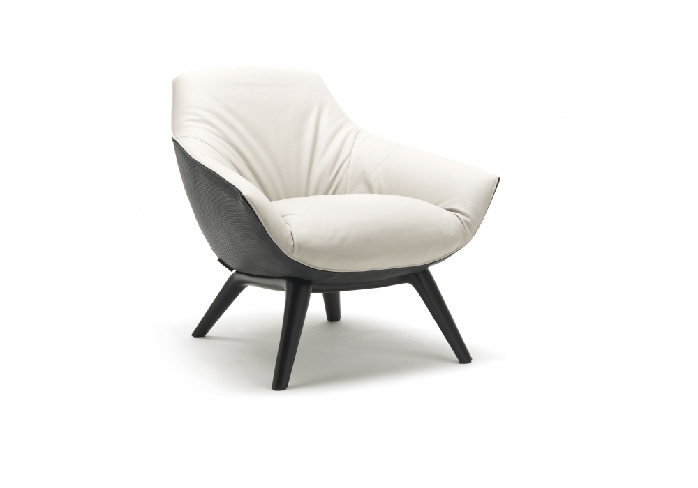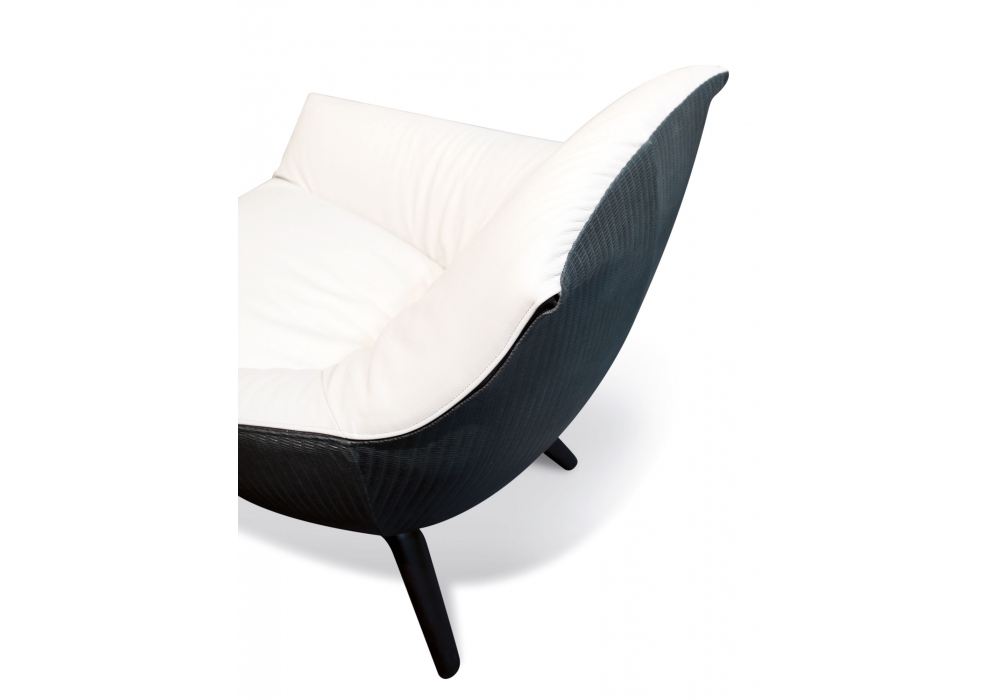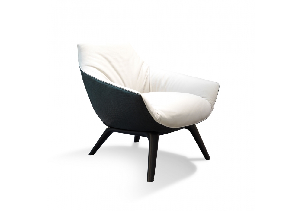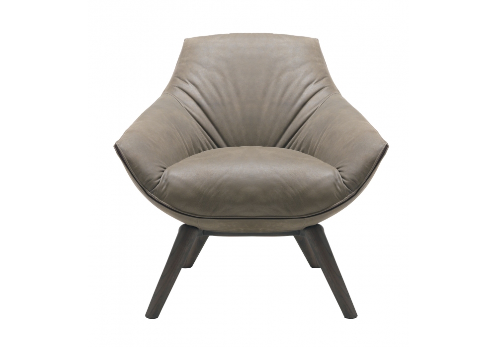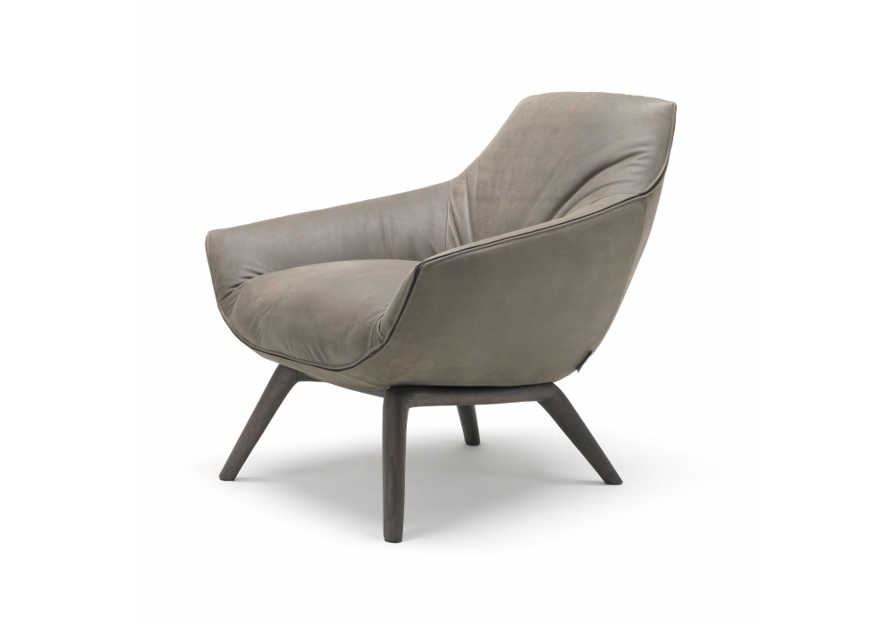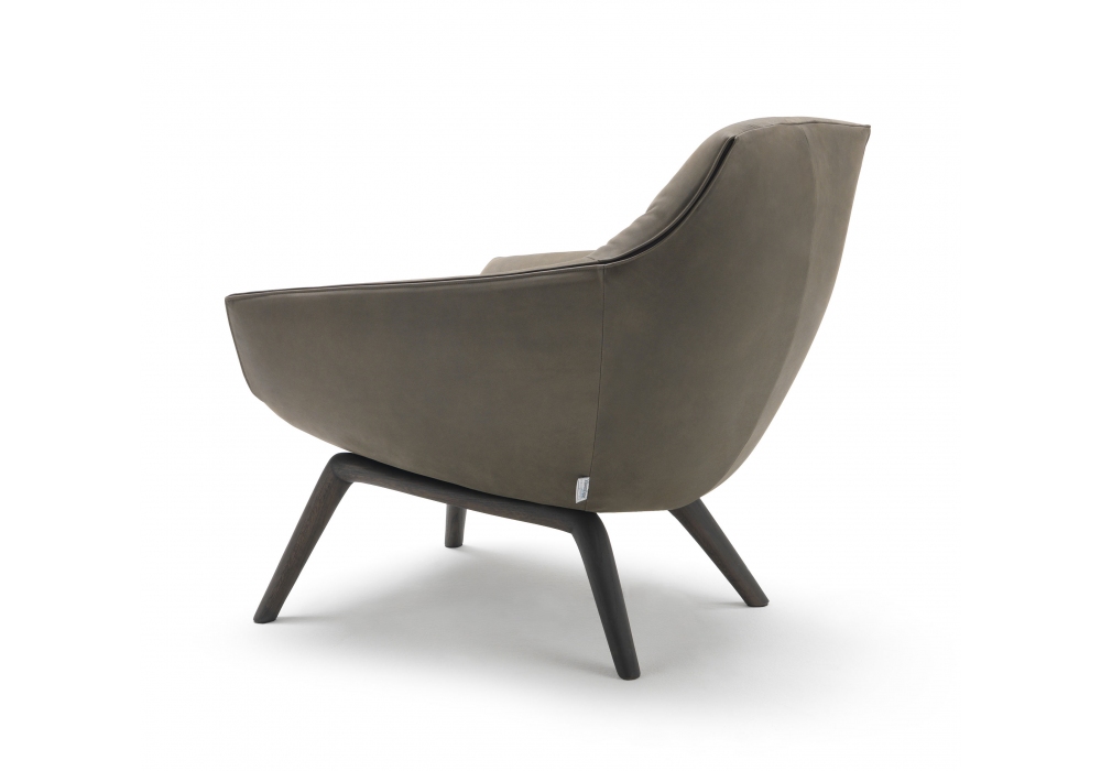 Florentia designed by Mauro Lipparini for MisuraEmme is an armchair made with a handcrafted base in stained solid oak and cold-foamed polyurethane shell with fabric or leather cover, removable by expert personnel. Upon request, it is possible to cover the front of the armchair with a different fabric from the back.