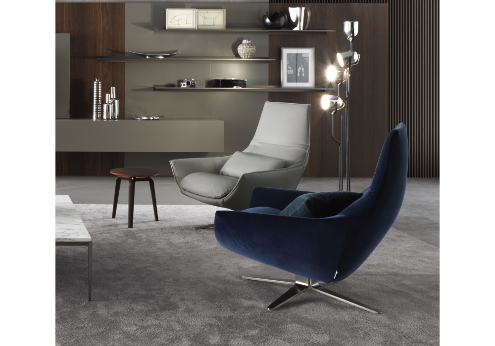 Ermes designed by Mauro Lipparini for MisuraEmme is an armchair made with a swivel base in gunmetal painted metal and a cold-foamed polyurethane shell with fabric or leather upholstery, removable by expert personnel. Upon request, it is possible to cover the front of the armchair with a different fabric from the back.