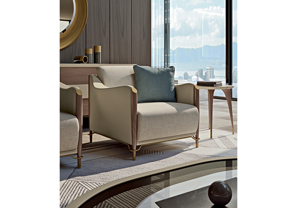 Melting Light designed by Frank Jiang for Turri is an armchair with structure in solid wood and plywood upholstered with multi-density polyurethane foam with cushions and structure covering in different leathers or fabrics. Legs in solid walnut and metal parts in brushed gold or bronze.