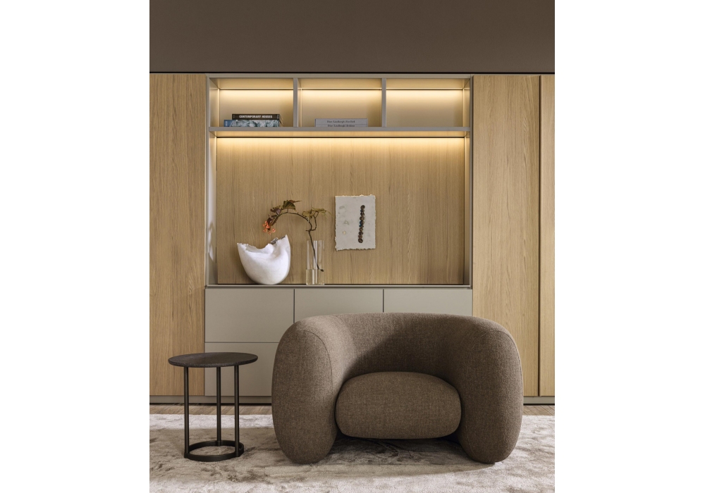Cinnamon designed by Naoto Fukasawa for Molteni&C is an armchair made with base with painted steel perimeter profile. Height-adjustable non-slip plastic tips. Structure in cold-foamed flexible polyurethane and fabric upholstery.