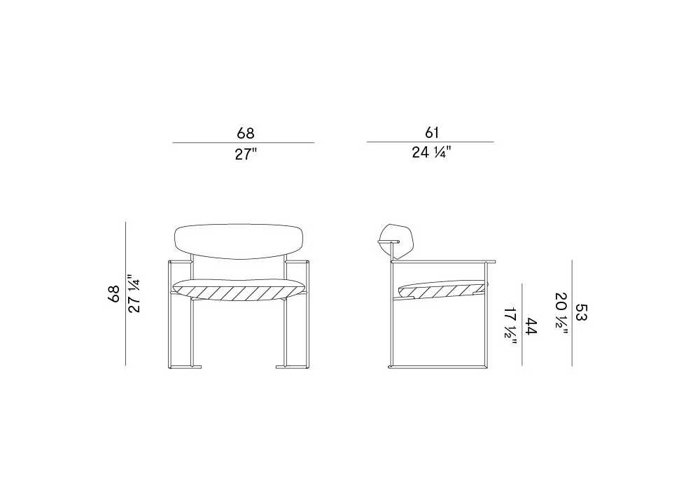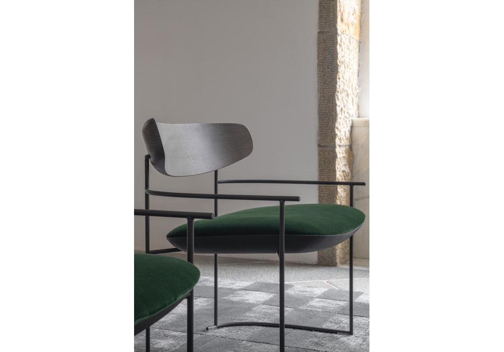Keel Light designed by M + V for Potocco is an armchair with structure in embossed painted metal rod, back in solid ash and seat upholstered in fire retardant polyurethane foam with covering in different leathers, fabrics or eco-leathers.
