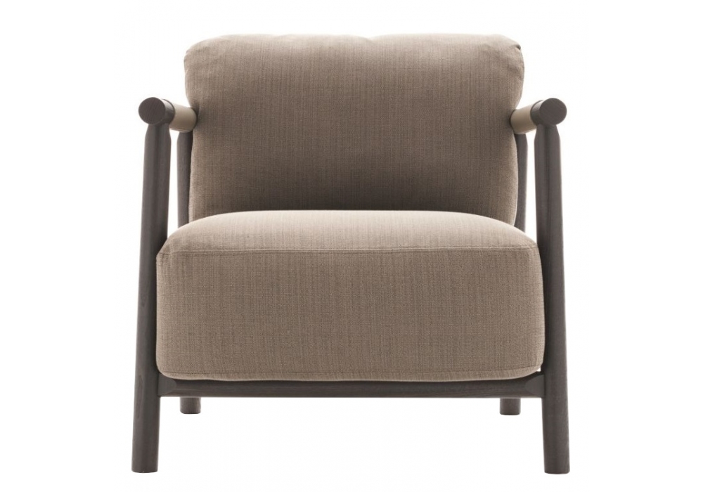 Nathy designed by Gabriele and Oscar Buratti for Ditre Italia is an armchair with wooden legs, upholstered seat and back covered in fabric or leather. Details of the rear upholstery of the backrest and armrests in genuine leather. Available in different finishes.