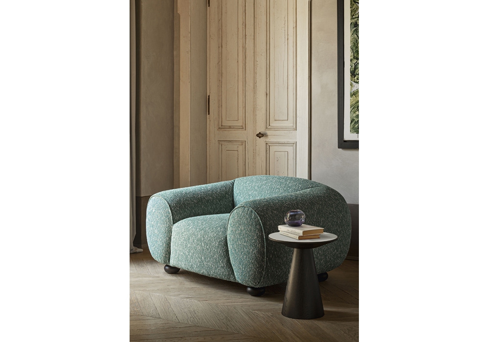 Regina designed by Pier Luigi Frighetto for Pianca is a padded armchair with fabric or leather upholstery. The wooden feet reflect the rounded shapes of the seat.