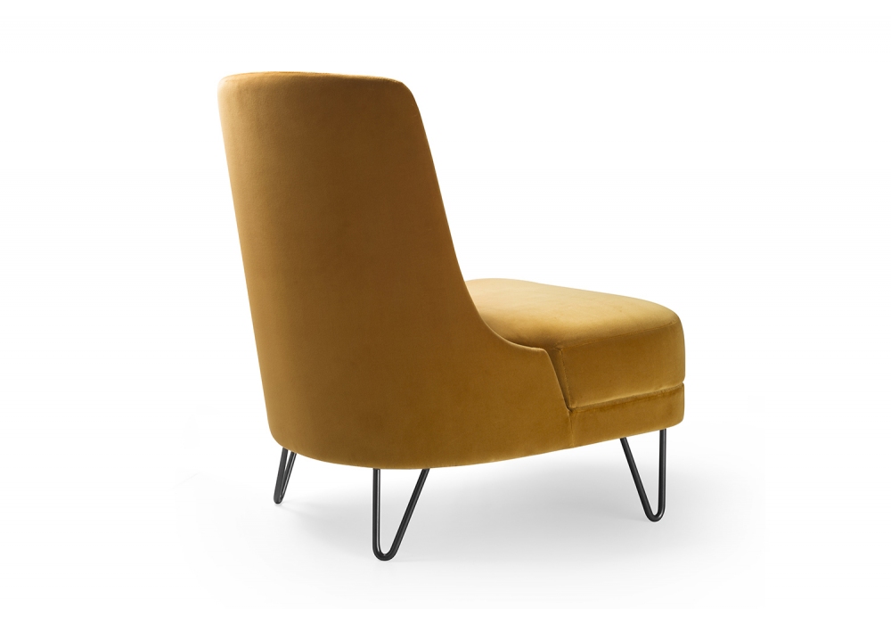 Chris designed by Umberto Asnago for Bodema is an armchair made with a curved wooden structure covered in polyurethane foam of different densities. A feather lumbar support pad is provided as standard, covered with a cotton lining. Metal feet available in anthracite and bronze finishes.