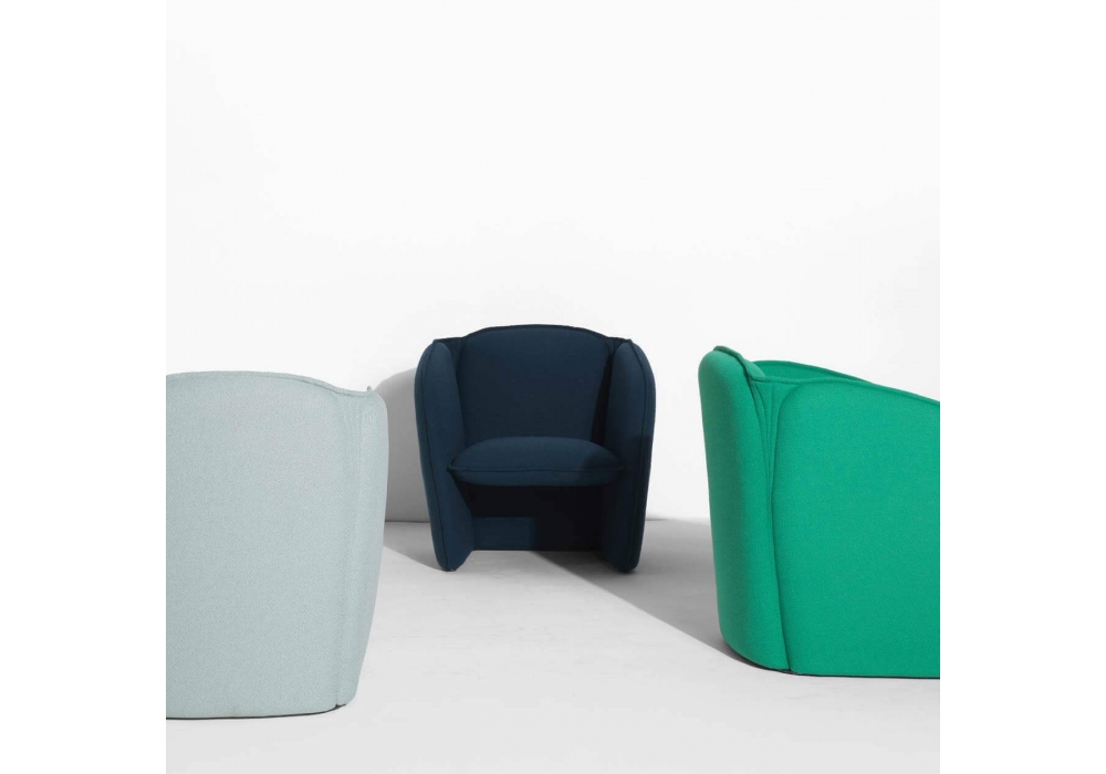 Lily designed by Färg & Blanche for Petite Friture is an armchair made with a recyclable steel frame, steel springs, 100% polyurethane fireproof HR foam padding and fabric upholstery.