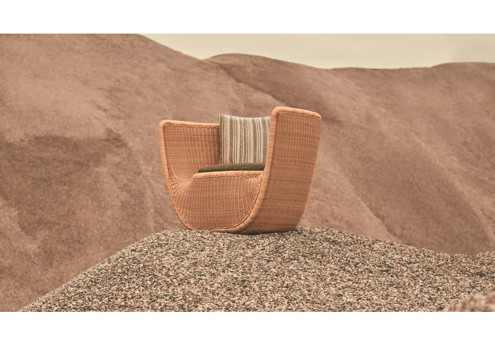 Afternoons designed by Omi Tahara for Depadova is an outdoor armchair with aluminum frame and shell in honey-coloured extruded PVC weaving and padding in polyurethane foam and polyester wadding. The covering is in water-repellent canvas available in different finishes. The feet are made of thermoplastic material.