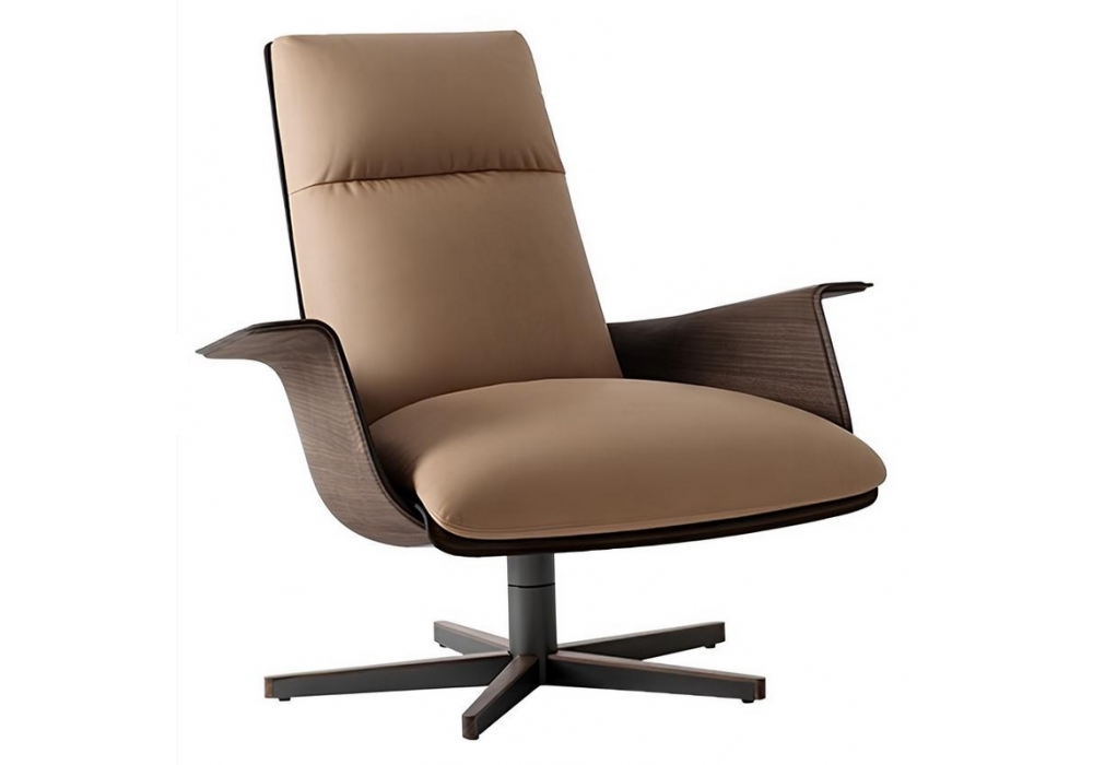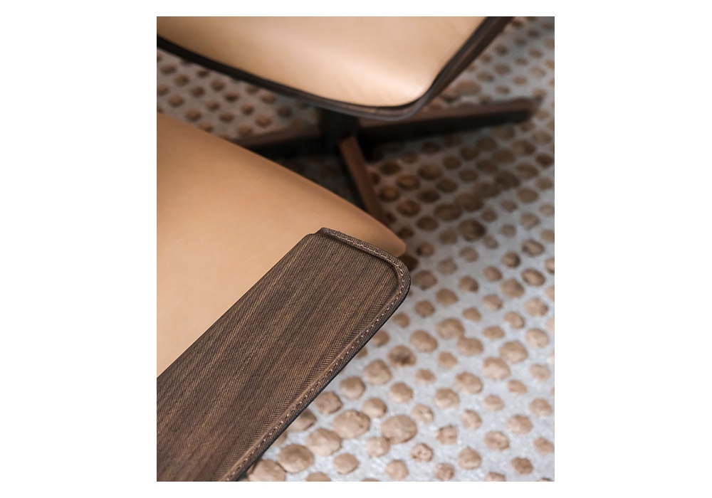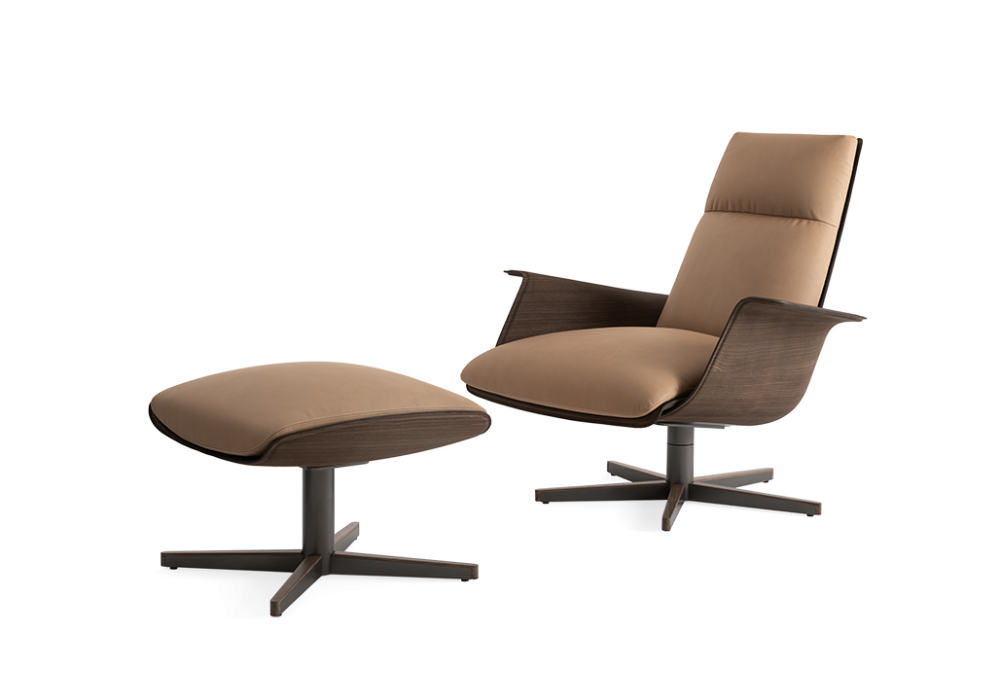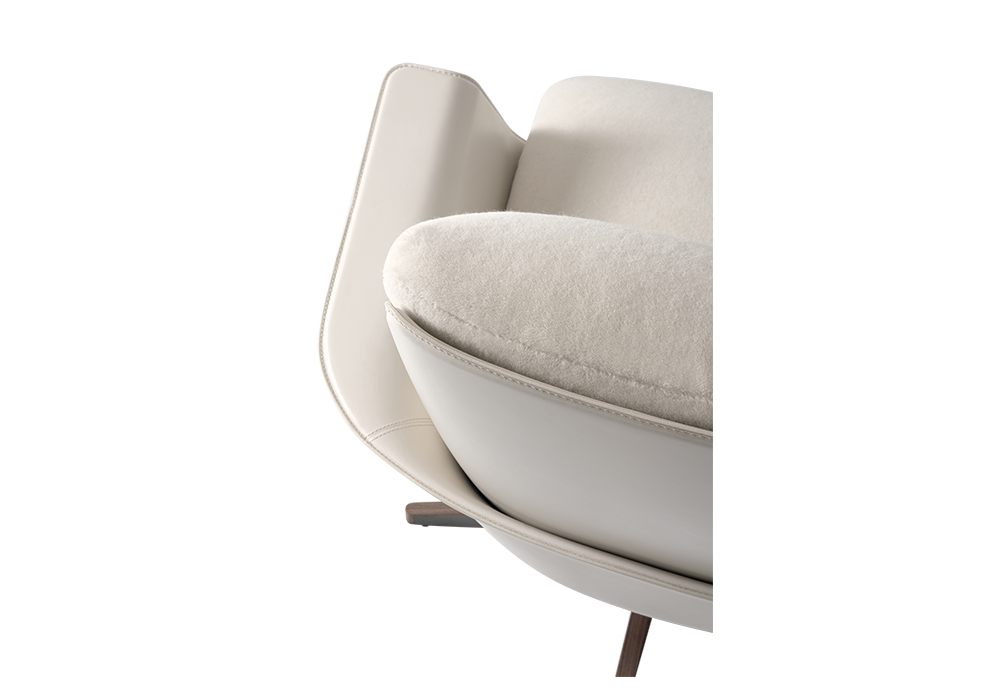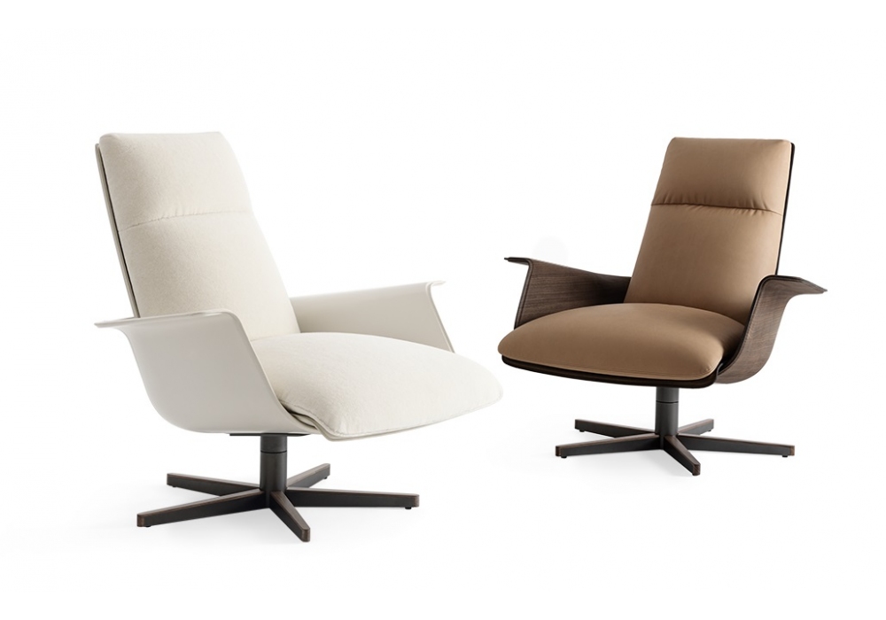 Clori designed by Carlo Colombo for Giorgetti is a swivel armchair with structure in leather or flexible wood, metal base and inserts in Canaletto walnut. Upholstery available in fabric or leather. Possibility of adding a pouf.