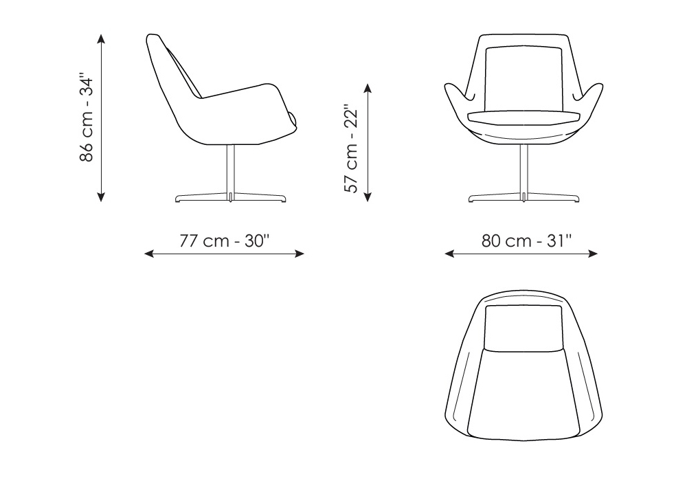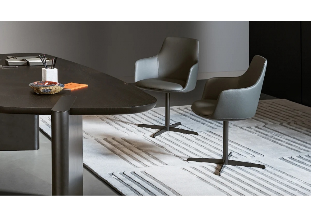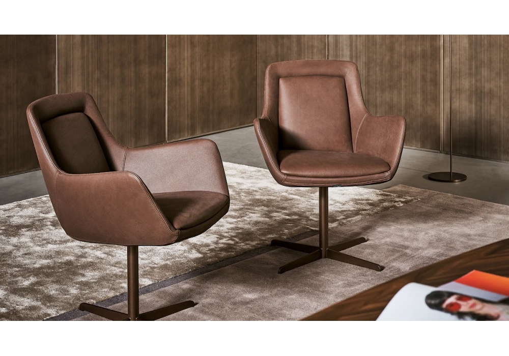 Newton Low designed by Bonaldo Lab for Bonaldo is an armchair made of steel, swivel base, padded seat and backrest with fabric or leather covering. Also available in the two-colour and two-covering version, fabric seat, leather front cushions.