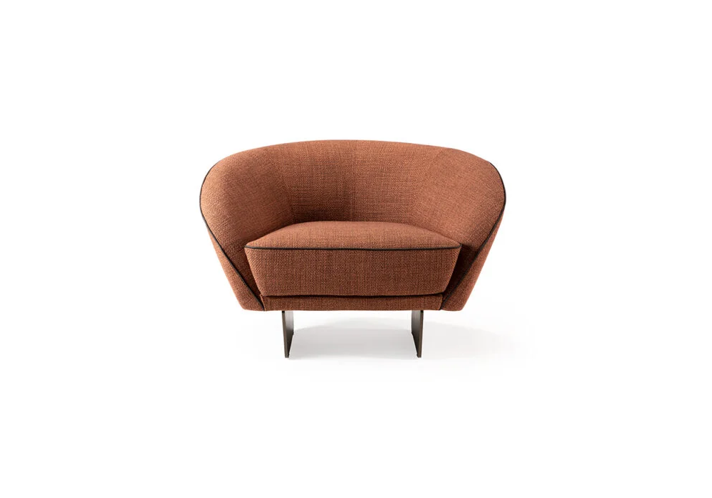 Segno designed by Pininfarina for Reflex Angelo is an armchair with wooden structure padded with polyurethane foam and seat cushions in non-deformable polyurethane. Metal base and fabric or leather covering, with matching or contrasting piping.