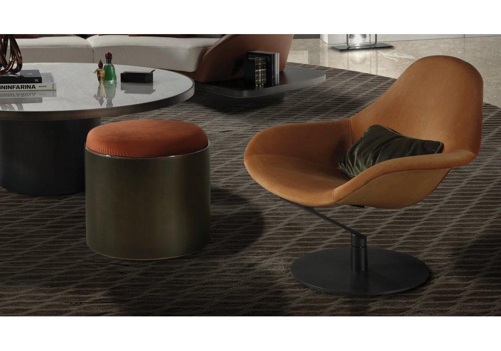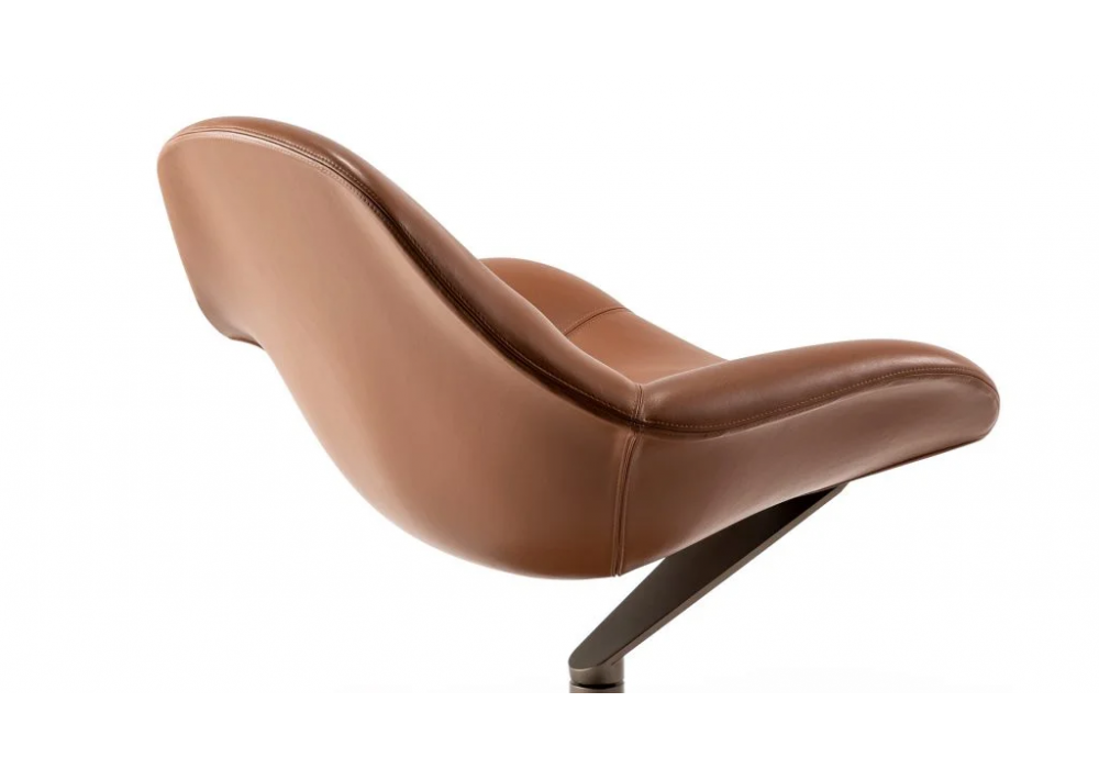 Zenith designed by Marco Cocco for Reflex Angelo is an armchair covered in leather or fabric. Round and swivel base in satin brass, dark brass, titanium or dark titanium finish metal. Available in 2 dimensions.
