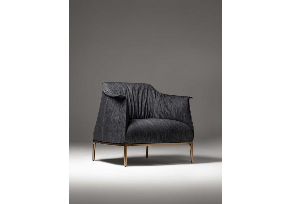 Archibald Denim Edition designed by Jean Marie Massaud Poltrona Frau is an armchair made with organic cotton jacquard fabric upholstery that features the typical twill structure of denim, made with a special wash that makes it even more resistant and suitable for covering upholstered furniture. The cotton, of natural origin, is GOTS (Global Organic Textile Standard) certified, and can be dry cleaned. Base in antiqued bronze. In addition, the armchair is embellished with a Camel-colored Cuoio Saddle Extra label, with the heat-stamped logo and the words “Archibald Denim Edition. Unique, like you” sewn on the back. Unique like all the pieces that are handmade by Poltrona Frau artisans.