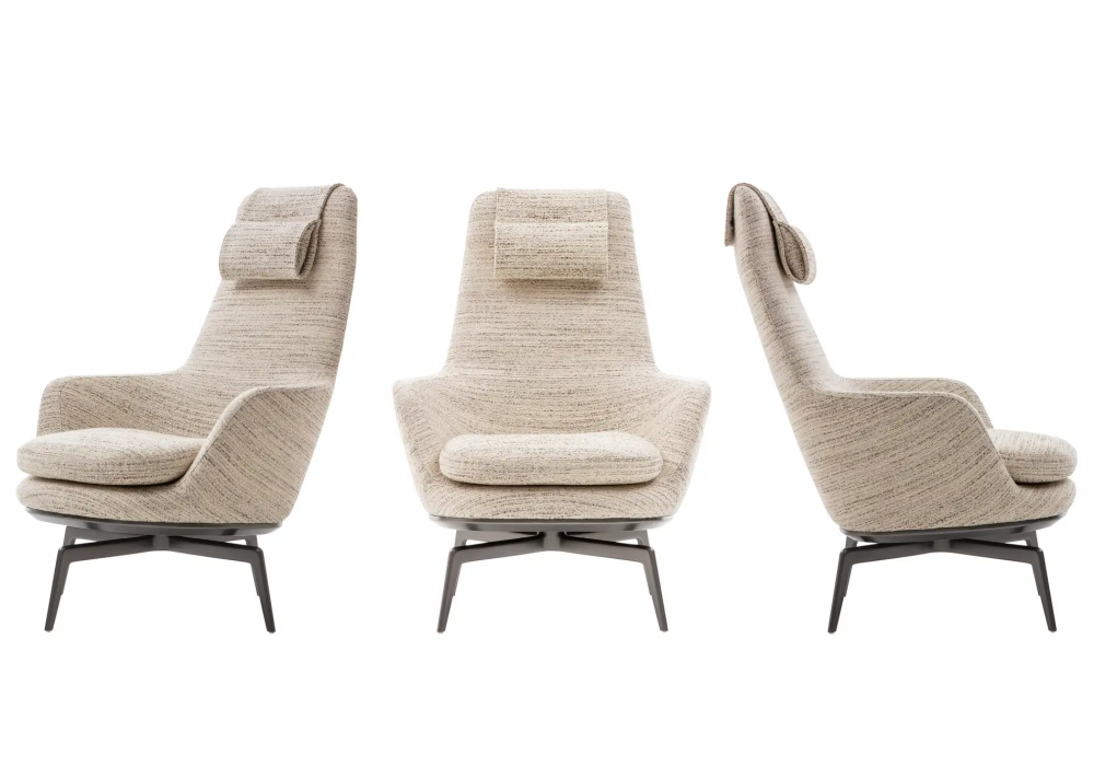 Caratos designed by Antonio Citterio for Maxalto is a swivel armchair with headrest with painted aluminum structure in various finishes and fabric or leather upholstery.